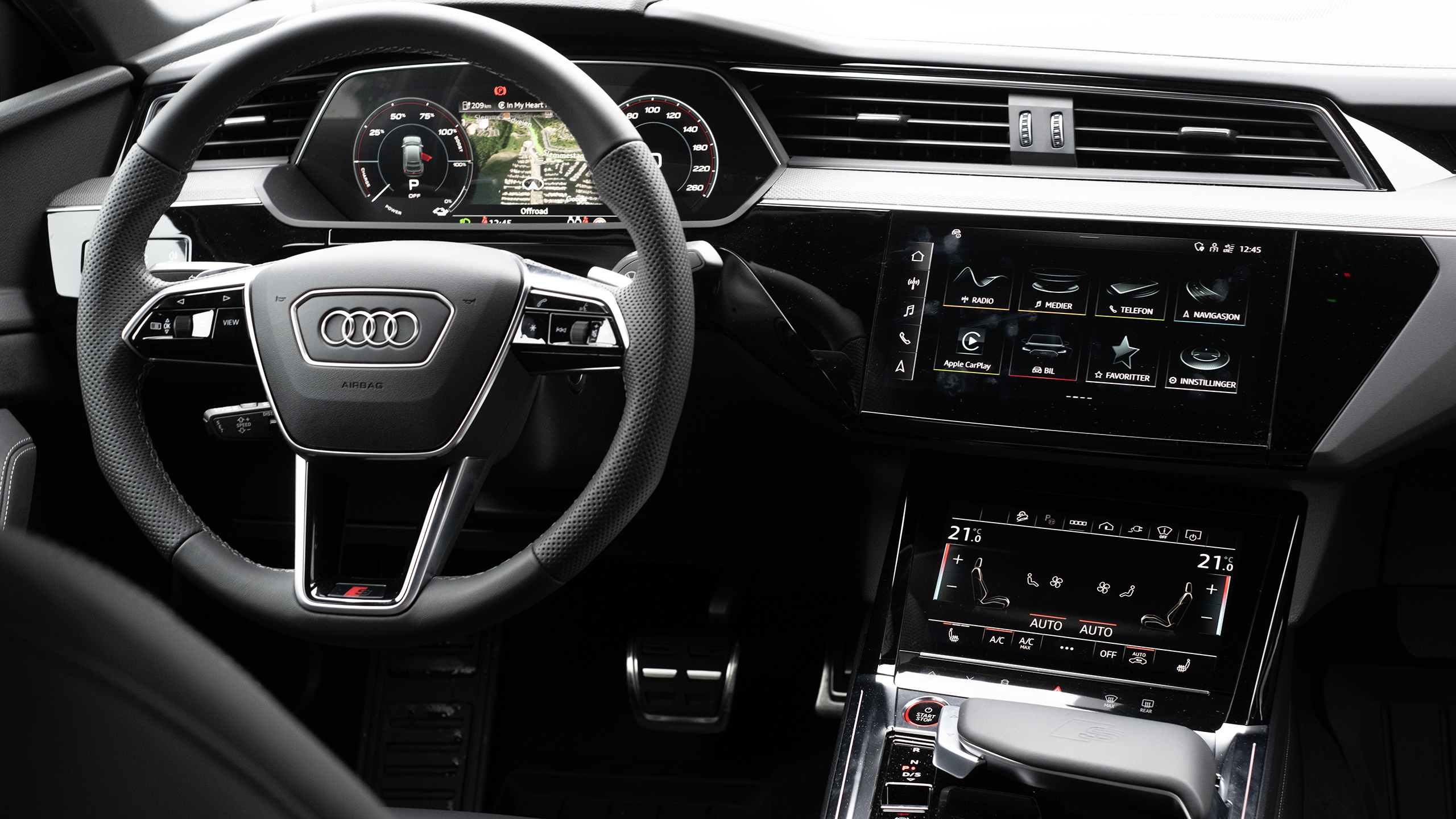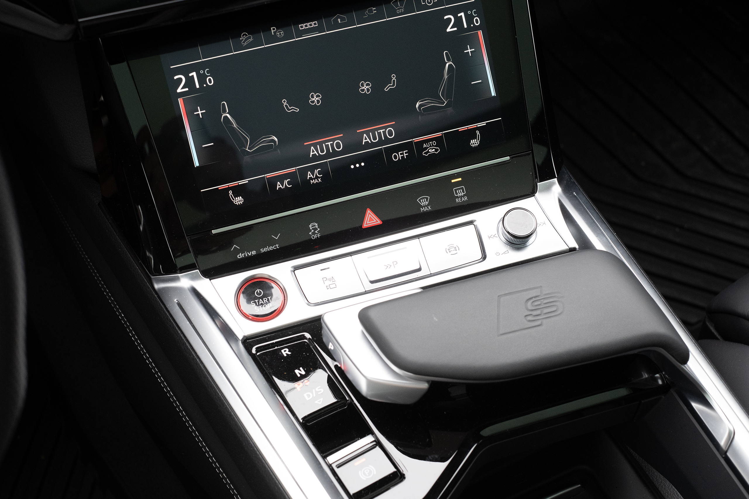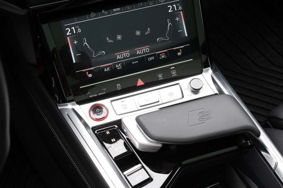 Det är lätt att hitta en bra sittställning i sportsätena och man har god sikt. Den mekaniska växelväljaren i mittkonsolen har överlevt från förra e-tron. Tyvärr har bilen de haptiska skärmarna som är uppdelade i två och kräver att man faktiskt trycker med fingret på den valda funktionen. Här räcker det inte med en lätt beröring och har du suttit i en Tesla, Mercedes eller Volvo känns det hopplöst omodernt.