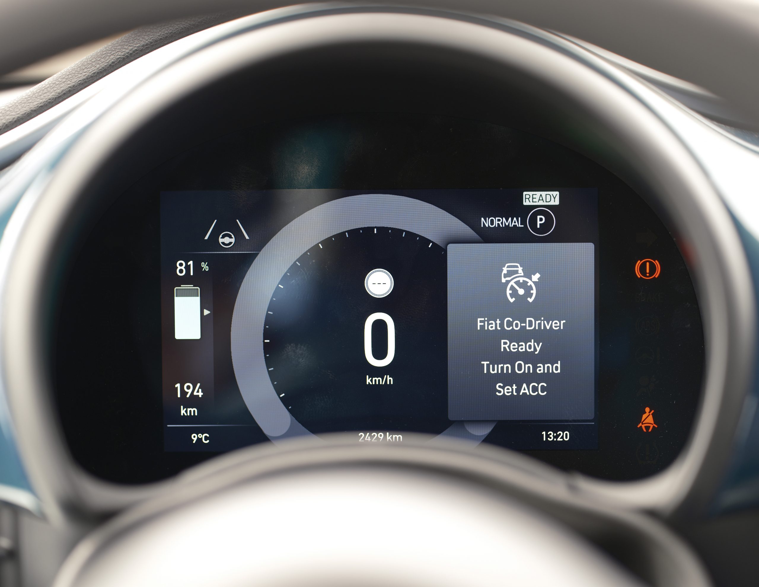När man satt sig tillrätta bakom ratten i konstläder stirrar man på två skärmar. En mitt framför föraren och – om man har valt Icon-utrustningspaket – en 10,25-tums pekskärm mitt på instrumentpanelen. Cinerama Infotainment kallar Fiat det och kan bäst beskrivas som ett omfattande paket med navigering, 360-kamera, DAB-radio, Apple Carplay och Android Auto, programmering av laddningssekvenser, röststyrning (Alexa om man kopplar upp My WiFi i bilen) och en inställningsmeny för strålkastare, låsning och mycket mer.