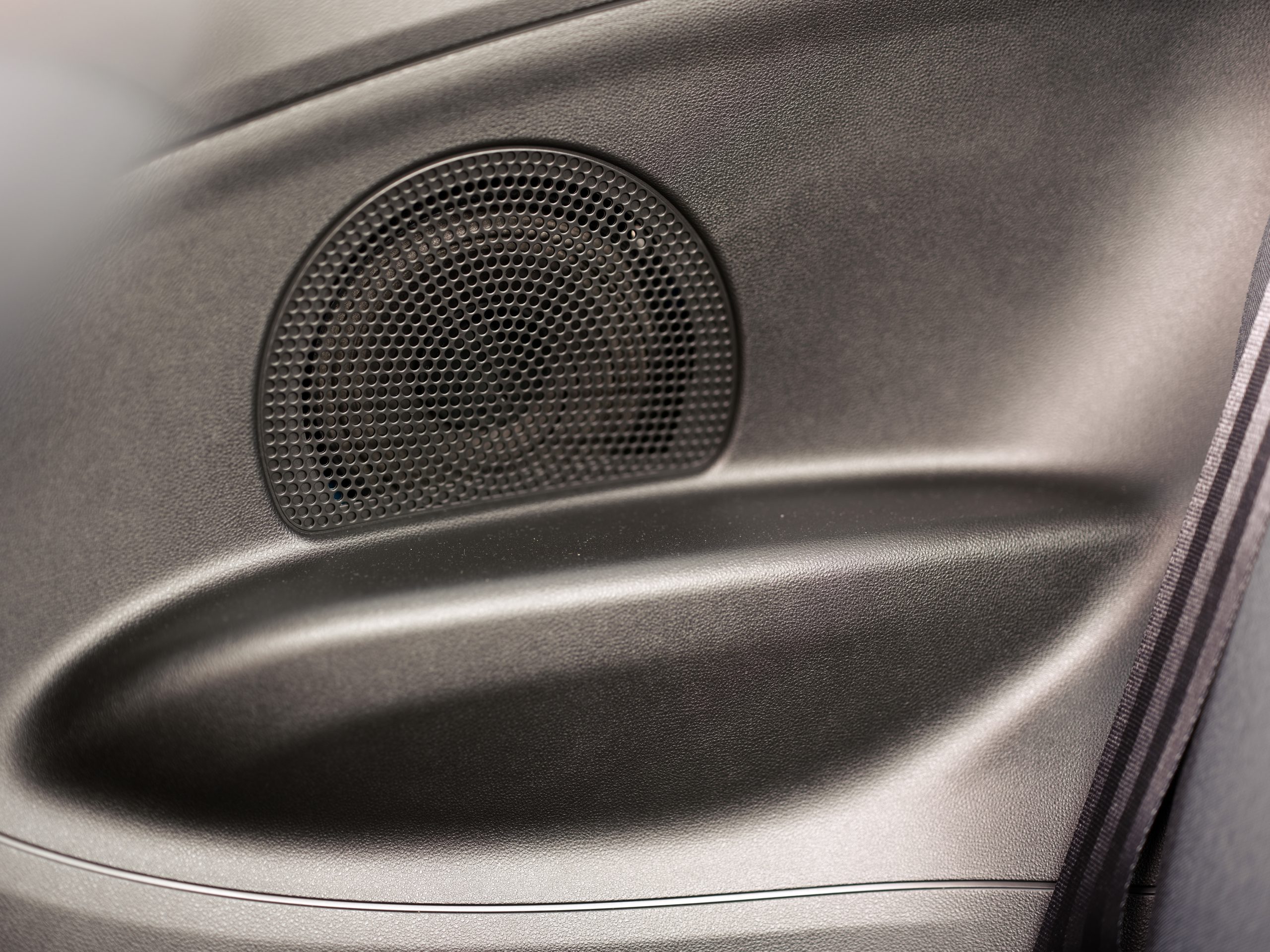 Man kan inte välja mellan olika ljudsystem i 500 Electric. På den här nivån får man sex högtalare: två bak, två fram och diskanter i A-stolparna. Det blir inte riktigt samma ljudnivå som från Harman Kardon-systemet i Cooper SE, men bortsett från att Fiat-anläggningen inte har särskilt mycket bas så fyller den den lilla bilen med högst acceptabel ljudkvalitet. Mellanregistret är tillräckligt tydligt för att man ska kunna sjunga med i favoritlåtarna och basen är tillräckligt levande för att man enkelt ska kunna följa musikens rytm.