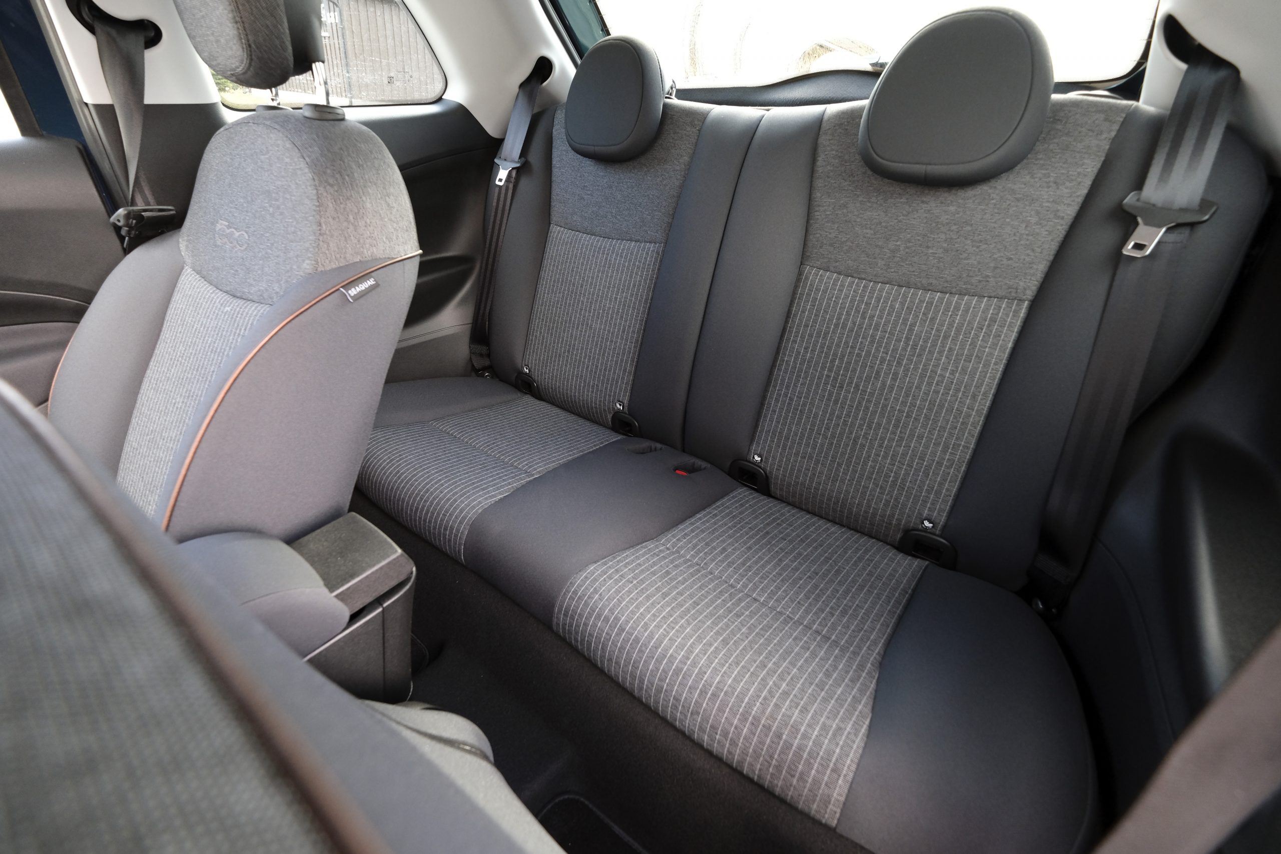 500 Electric är faktiskt ganska rymlig inuti. De två som sitter fram har gott om plats i lagom stora säten som ger bra stöd. Takhöjden är fenomenal, men i baksätet är det naturligtvis trängre. Speciellt på höjden, men man kan glida in fötterna under framsätena, och för barn är baksätet tillräckligt rymligt. Där och i passagerarsätet fram hittar man Isofix-barnstolsfästen. Sätena är klädda i Seaquel, ett material som är tillverkat av återvunnen plast, och instrumentpanelen är lackad i samma färg som bilen.