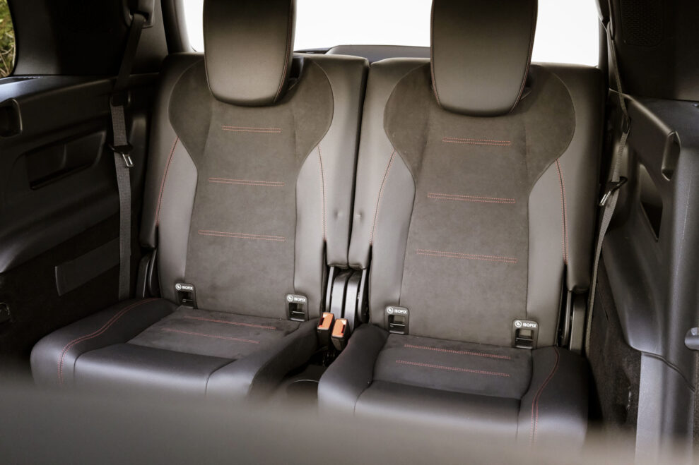 Sätesraden längst bak är inte som i en minibuss utan två mindre säten där man fäller upp ryggstöden och drar ut nackstöden när man behöver två extra sittplatser. Som är trånga. Det är de alltid. Och passar bäst för barn under 140–150 cm. Men de har Isofix-fästen, precis som två av stolarna i andra sätesraden. De kan för övrigt skjutas fram 14 cm så att lastvolymen i bagageutrymmet ökar från 465 till 655 liter – den blir hela 1620 liter om man fäller ner baksätena.