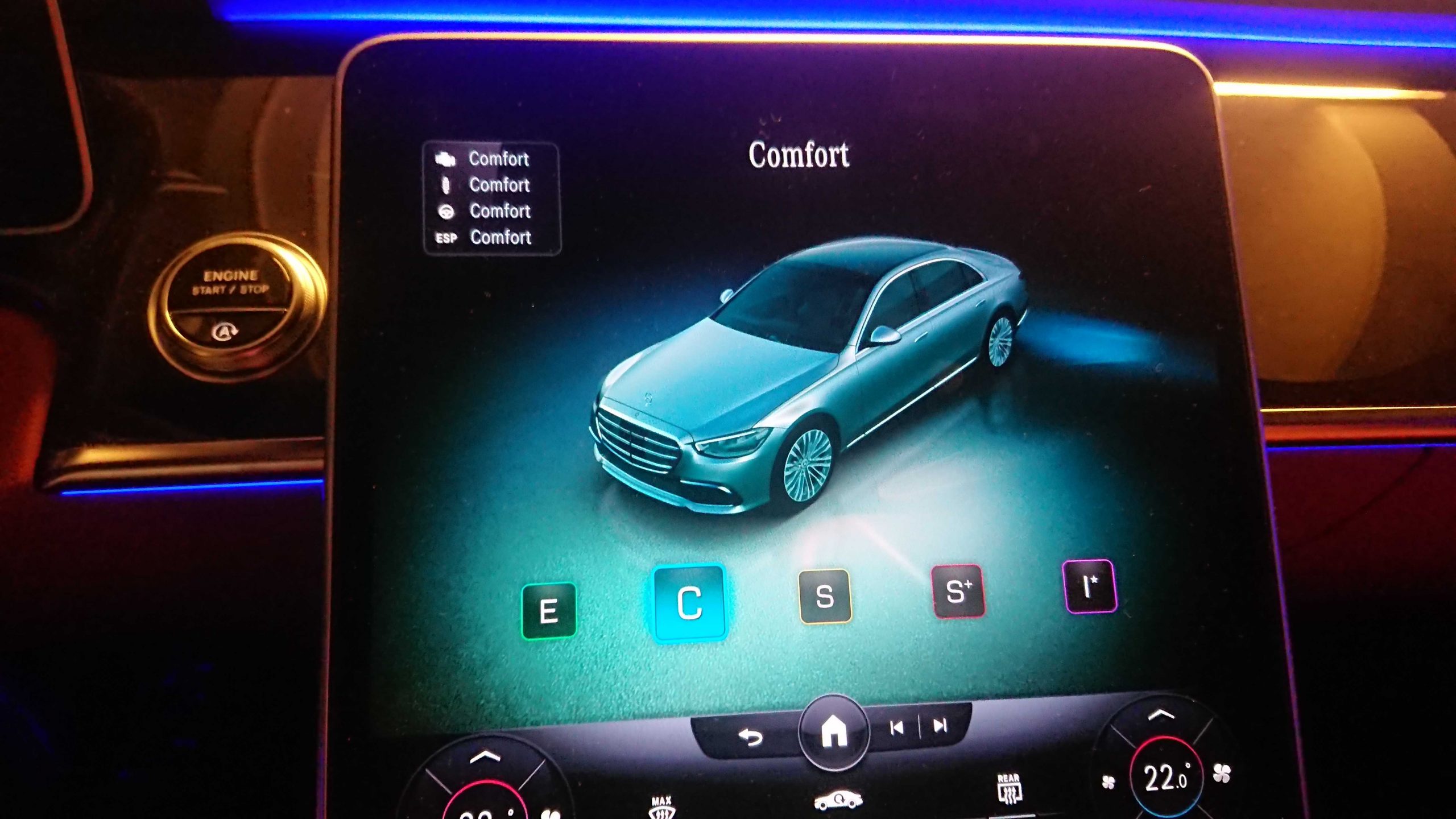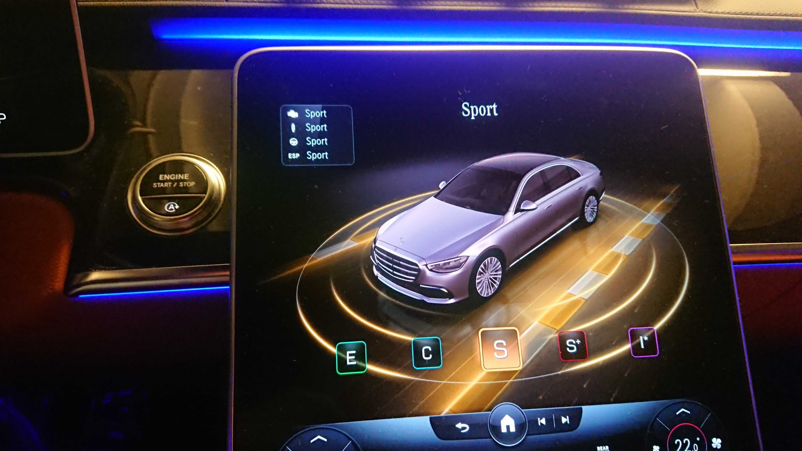 S-klass är utrustad med det helt nya gränssnittet MBUX (2.Gen) som manövreras med en snygg 12,8-tums OLED-skärm i mittkonsolen. Här kommer man åt nästan alla bilens funktioner och finesser. Fast man bör naturligtvis undvika att pilla för mycket med skärmen när man kör. Därför görs mycket av alla inställningar med rösten.
