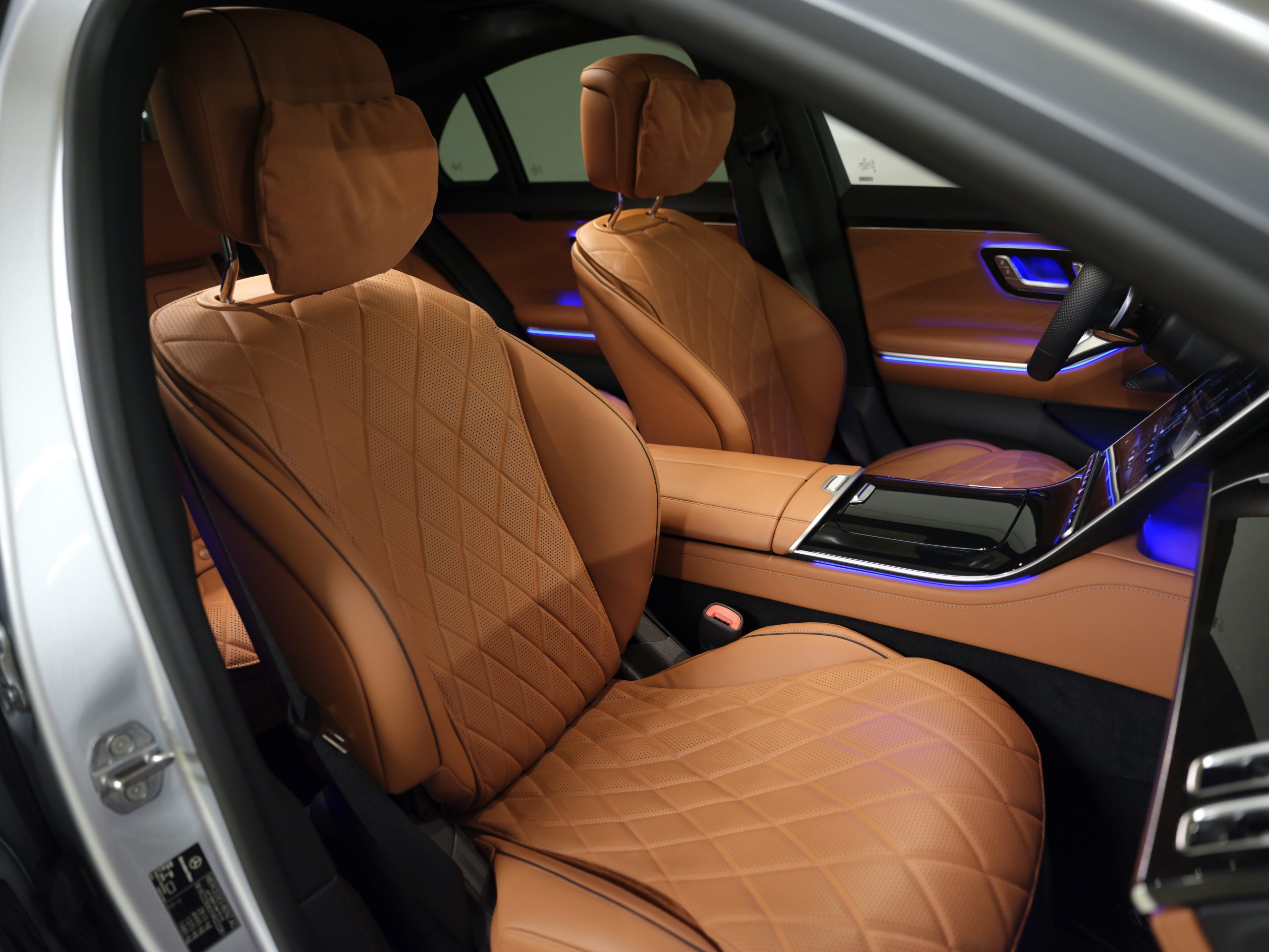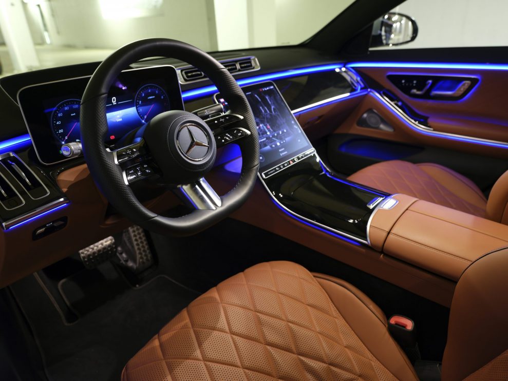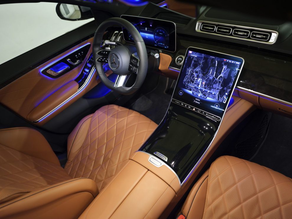 På utsidan ser den ut som en vanlig, diskret direktörsbil. Men på insidan dryper den av lyx: Mercedes har designat om interiören i S-klass från grunden, antalet knappar har minimerats och ersatts av en stor, Tesla-inspirerad OLED-pekskärm i mittkonsolen.