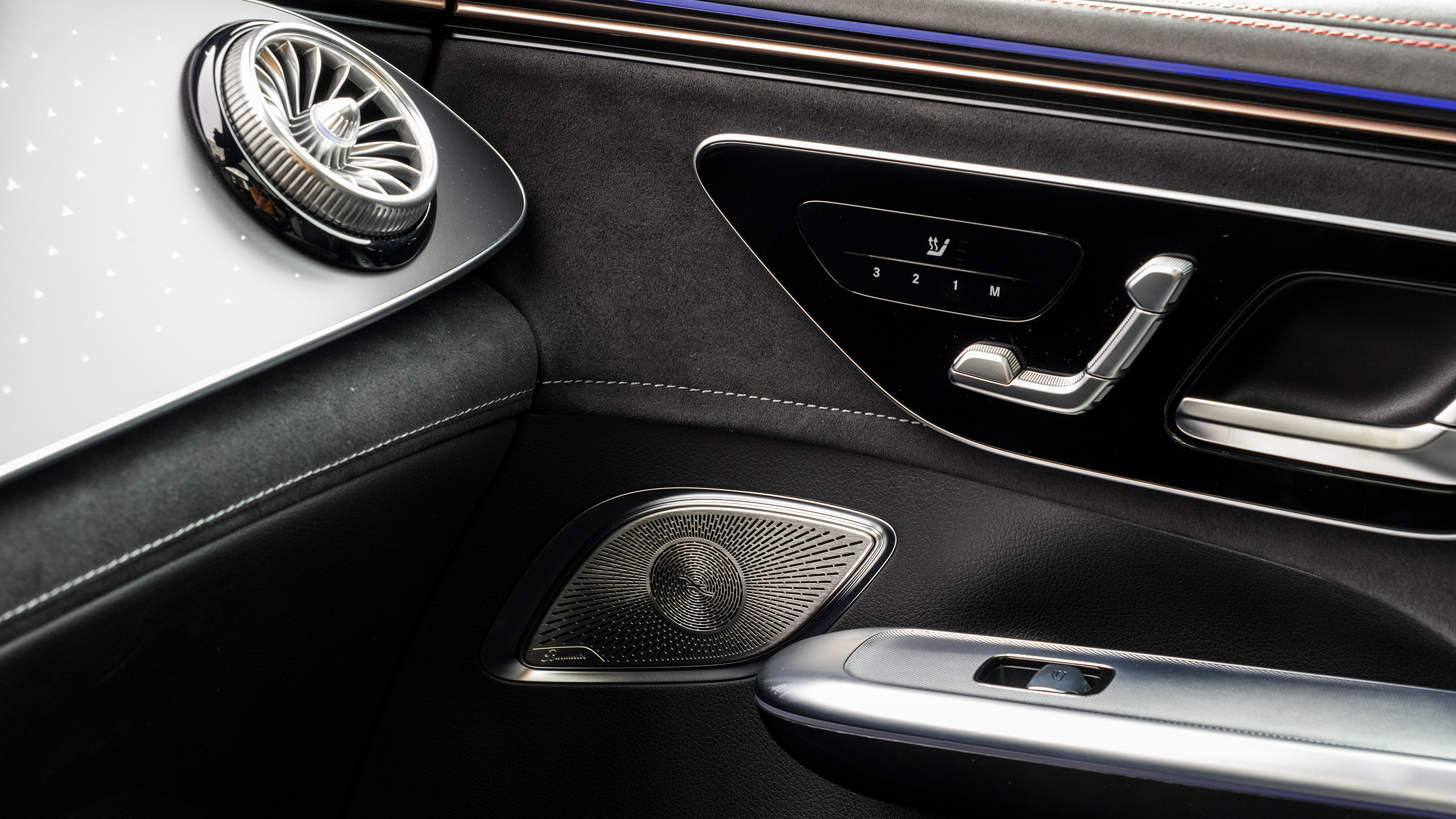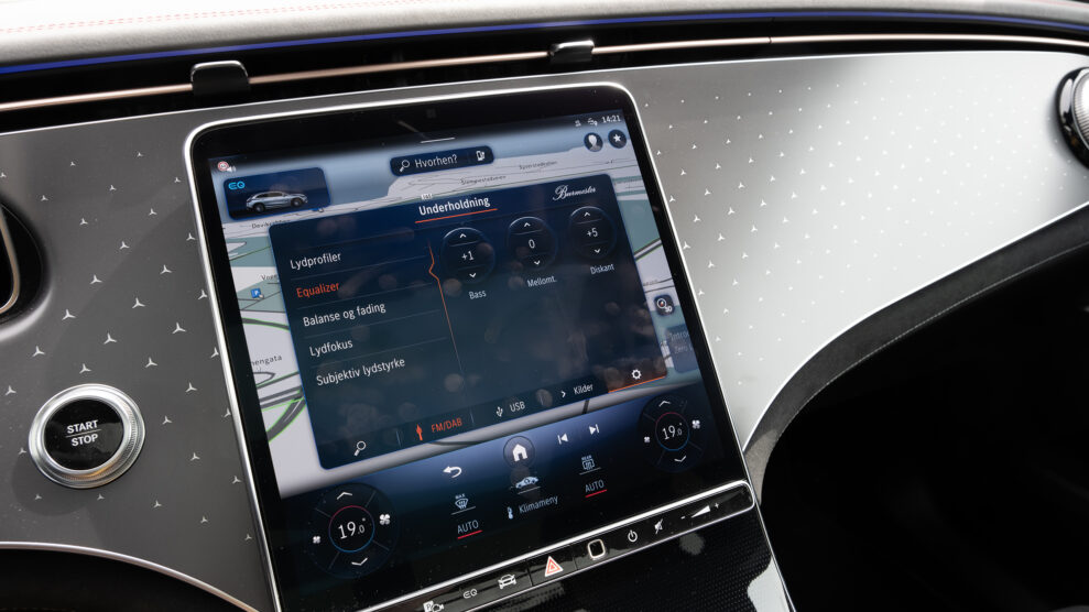 Burmester-systemet har 15 högtalare med en total effekt på 710 W och täcker hela kupén, men det har inte höjdkanalerna man får om man väljer Burmester i en EQS. Inte för att det spelar någon roll. Anläggningen spelar nämligen högt, rent och klart och har en mäktig basåtergivning som harmonierar väldigt bra med den öppna ljudbilden. Det enda vi saknar är lite fler justeringsmöjligheter. Equalizern är bara en tonkontroll som justerar bas, mellanregister och diskant.