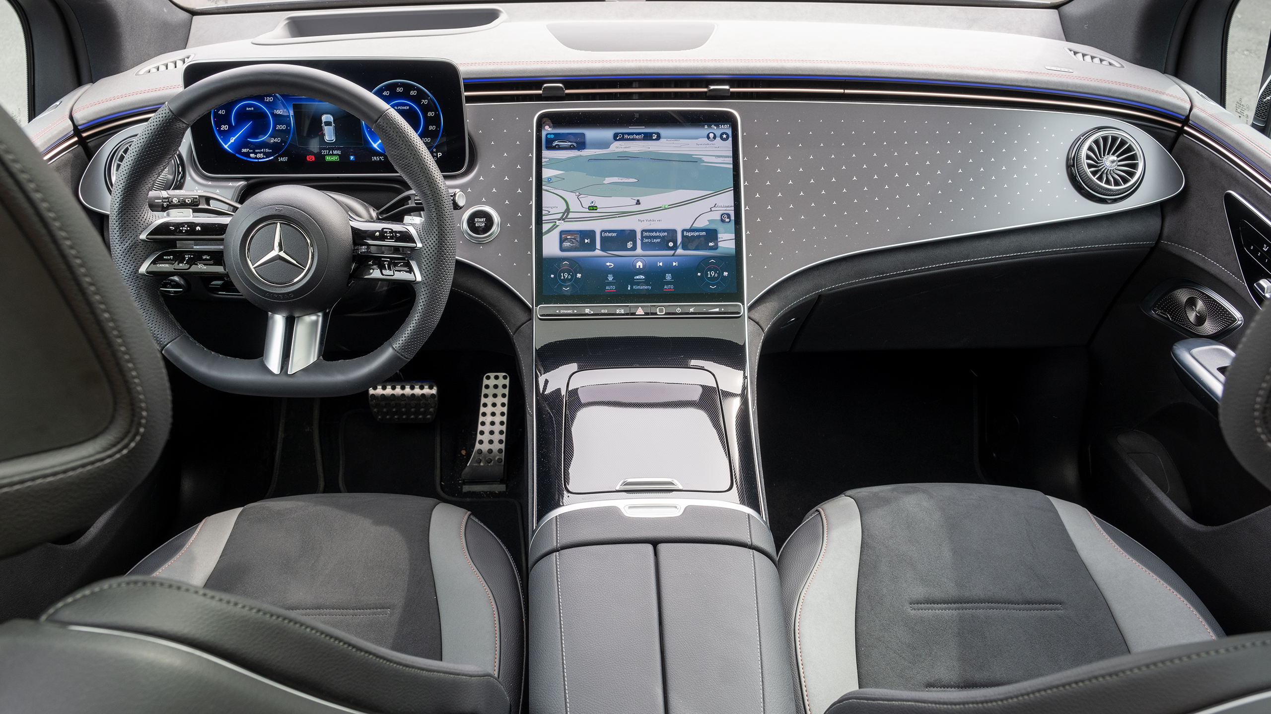 Mercedes förbluffade oss och många andra med Hyperscreen, en skärm som täckte hela instrumentpanelen. Den enorma glasytan har tre skärmar, varav en för passageraren, och vi har testat den i både EQS och EQS SUV. Den kan levereras till EQE SUV också, men vi tycker att den normala skärmen ger interiören ett renare utseende, och samtidigt sparar man mycket pengar.
