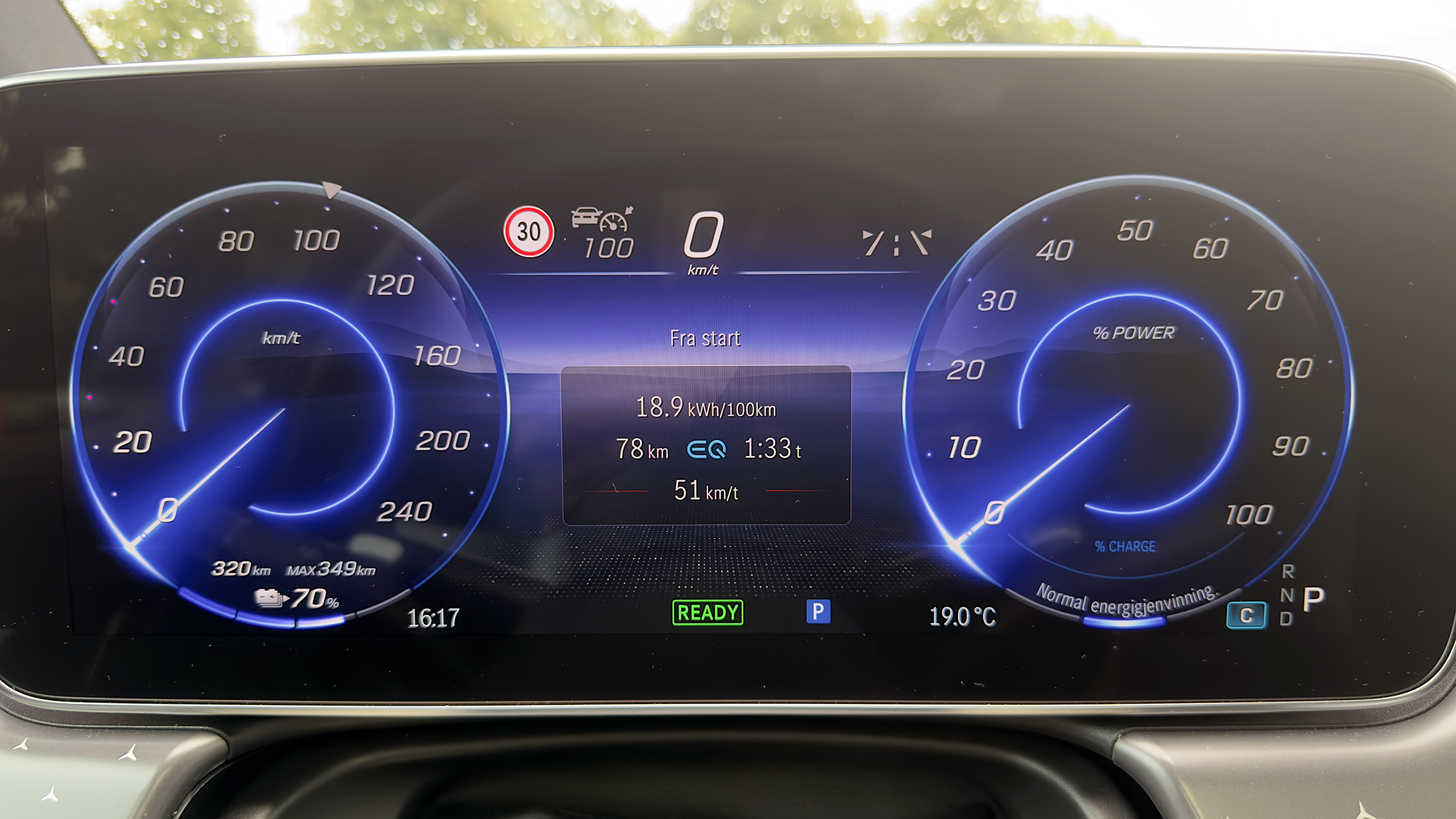 Mercedes själva uppger förbrukningen till mellan 17,8 och 21,5 kWh/100km, så vårt 18,9 ligger klart inom vad som kan förväntas.