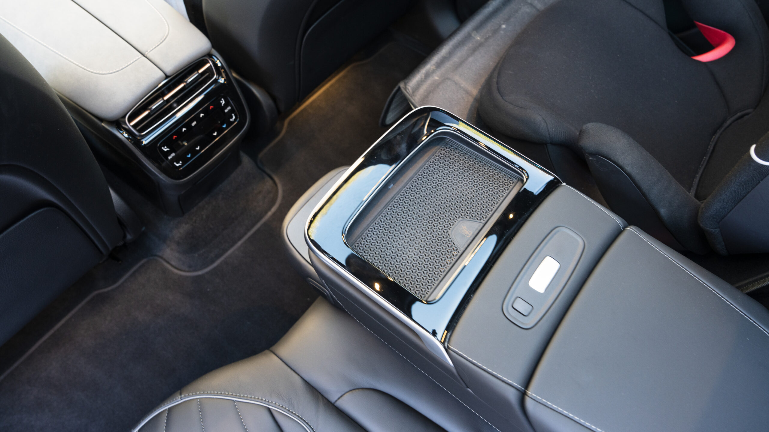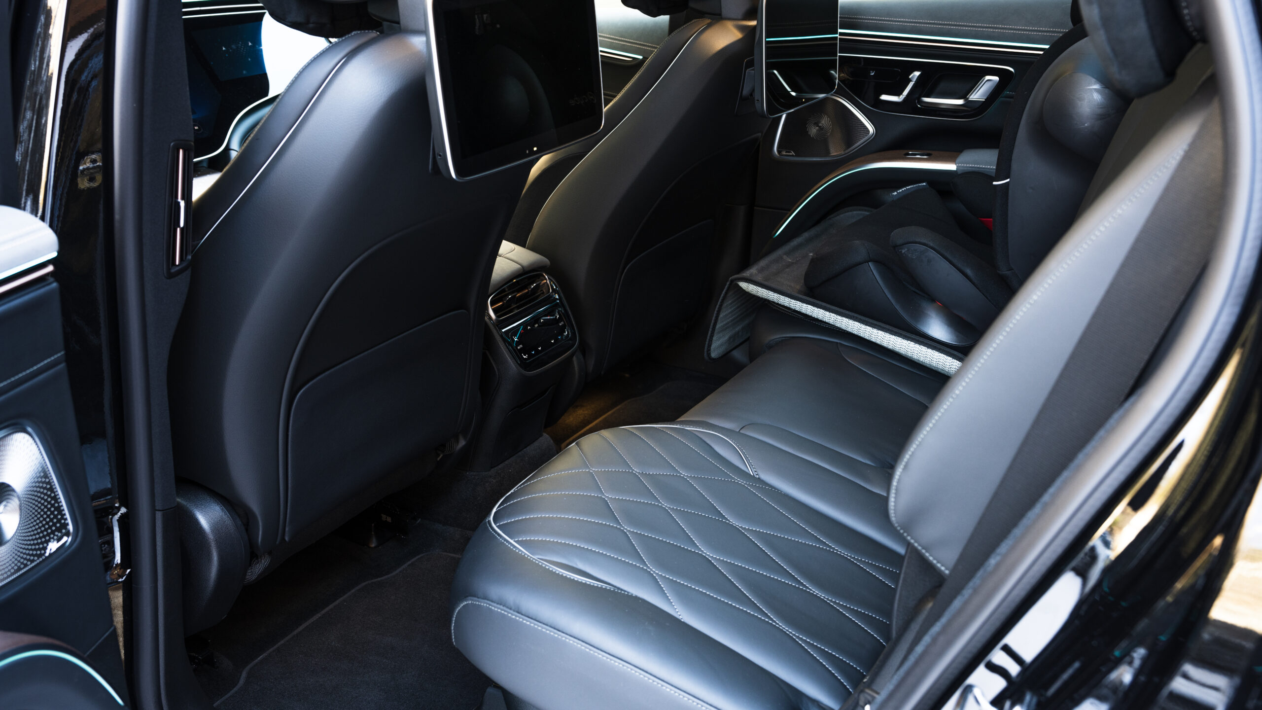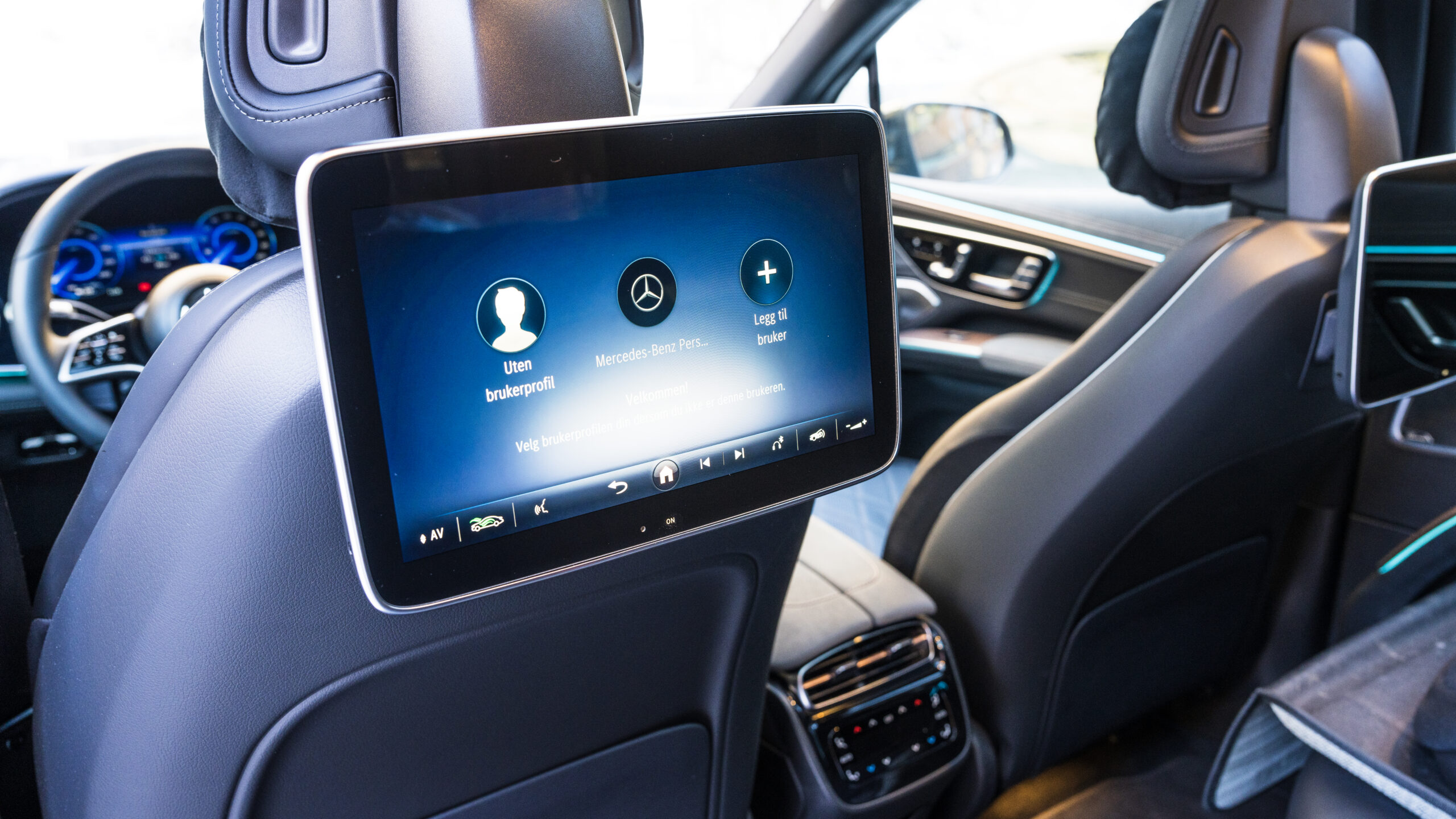 Vår testmodell har pekskärmar i baksätet (MBUX Rear Seat Entertainment) där man kan styra musikuppspelning, navigering och komfortinställningar – nästan allting utom att styra själva bilen.