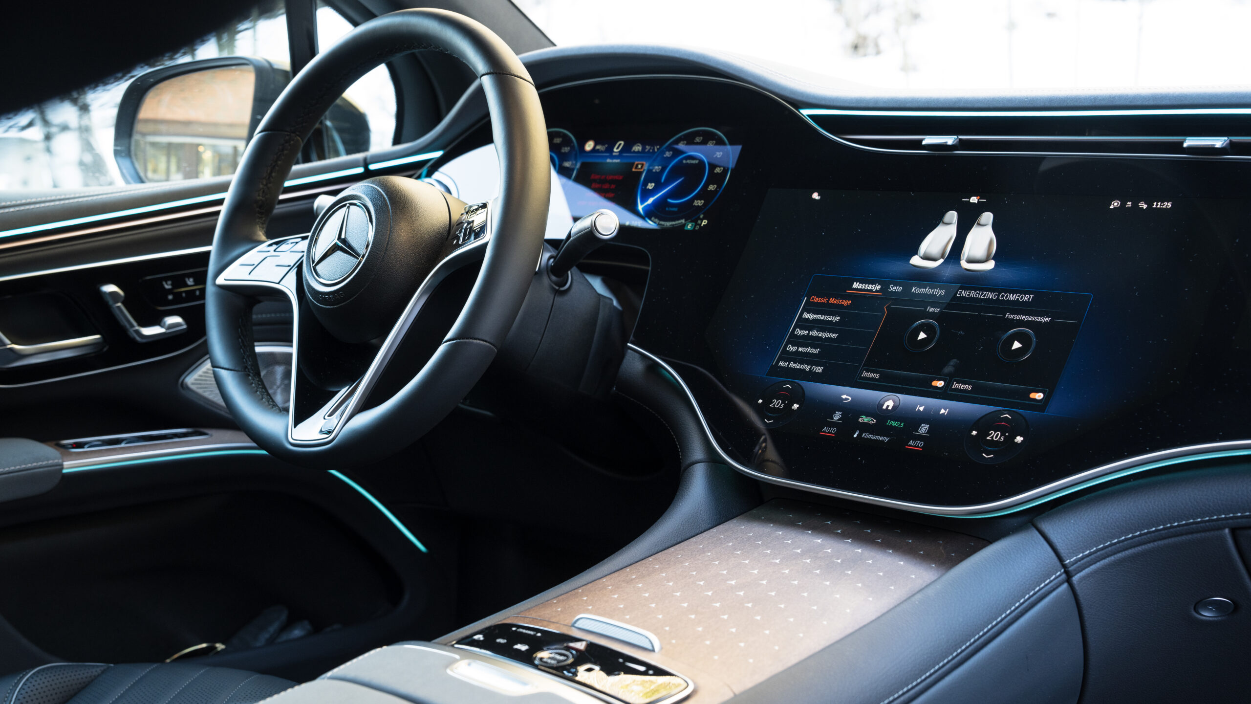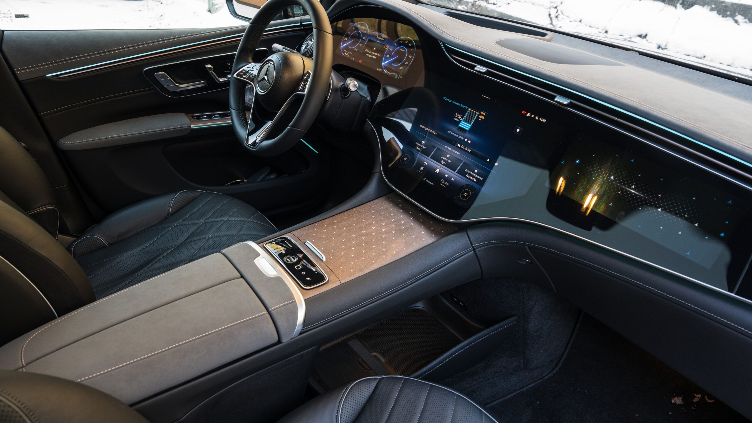 Inne i cockpiten finns det tydliga likheter med EQS, som kännetecknas av den stora instrumentpanelen och en bred mittdelare mellan framsätena.