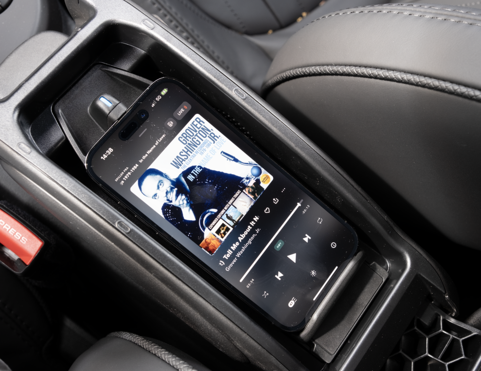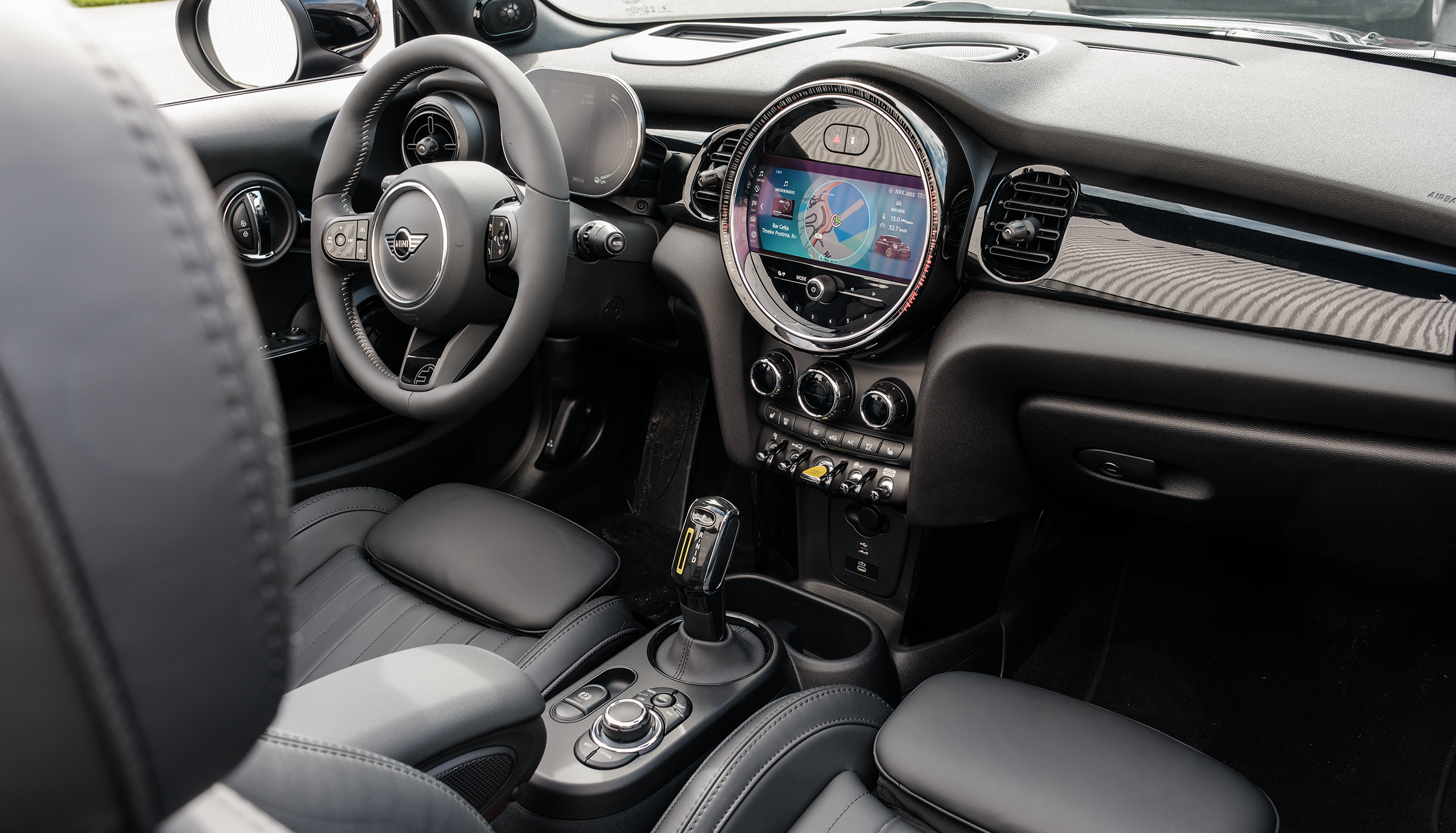 Framför föraren sitter en liten skärm med matt yta. Ovanför den finns en head-up display och i mitten en stor, blank pekskärm med navigering, Android Auto, Apple CarPlay och ett dugligt Harman Karbon-system med ganska potent och fylligt ljud. Det finns inga utrustningspaket. Allt ingår i priset. Det gäller även adaptiv farthållare, körassistent, backkamera, uppvärmda sportsäten och sportratt med värme.