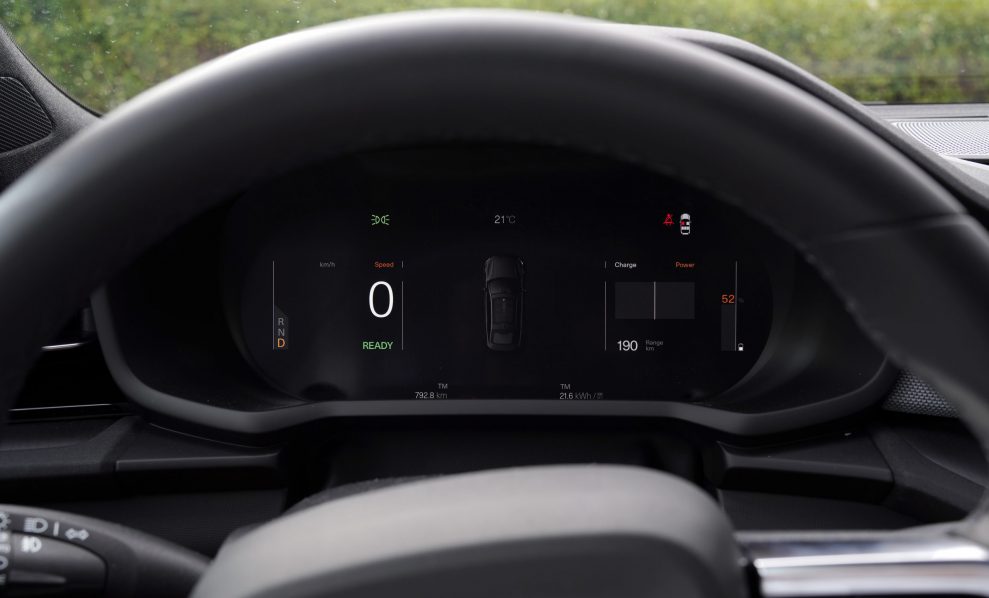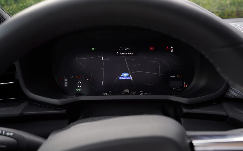 En annan sak man snabbt lägger märke till är att det finns två skärmar och fler knappar i en Polestar 2. Föraren får en 12,3-tums, konfigurerbar skärm framför sig, med nästan väl mycket information, knappar på ratten till en rad funktioner och separata knappar för avfrostning, värme i fram- och bakrutan samt start och stopp av musiken och en volymkontroll som både förare och passagerare kan använda.
