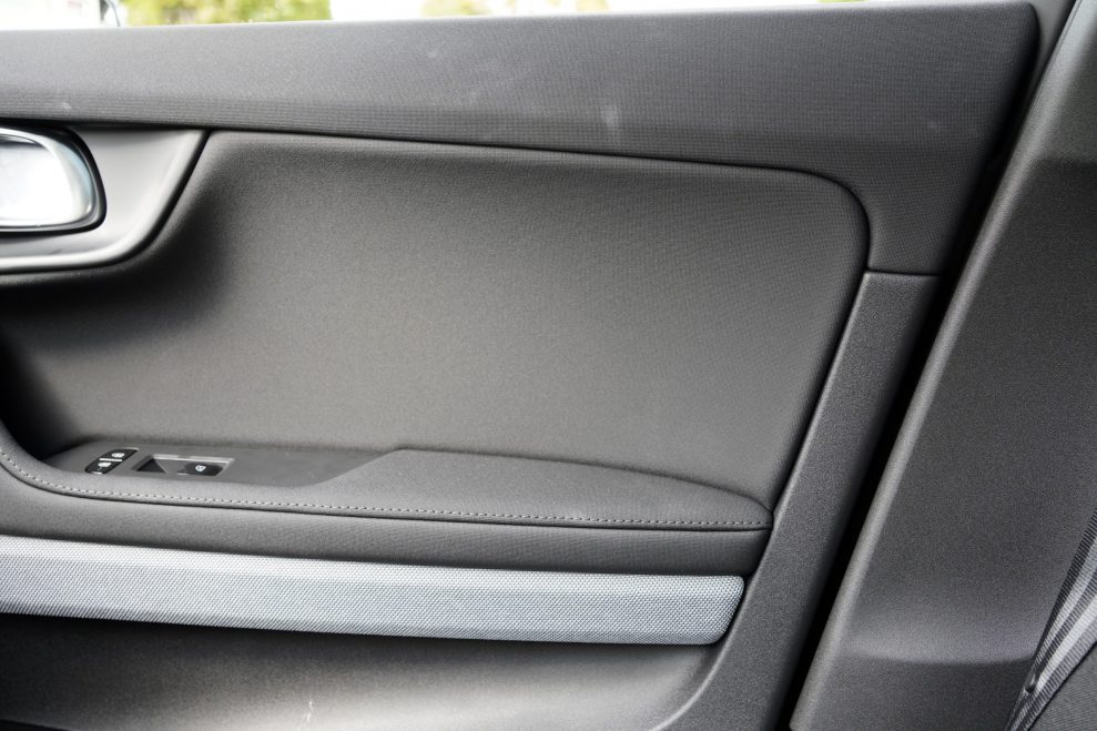 Interiörkvaliteten är märkbart bättre i Polestar 2, med bättre material, tjockare klädsel och bättre brusdämpning, men det finns ett par detaljer som försämrar ett annars så helgjuten känsla. Den grova plastkvaliteten i dörrsidorna suger åt sig fläckar och repor, den böjda plastkanten runt mittkonsolen verkar tunn och billig och det finns en markerad kant på insidan som inte passar så fint ihop med träfiberdekorationen.