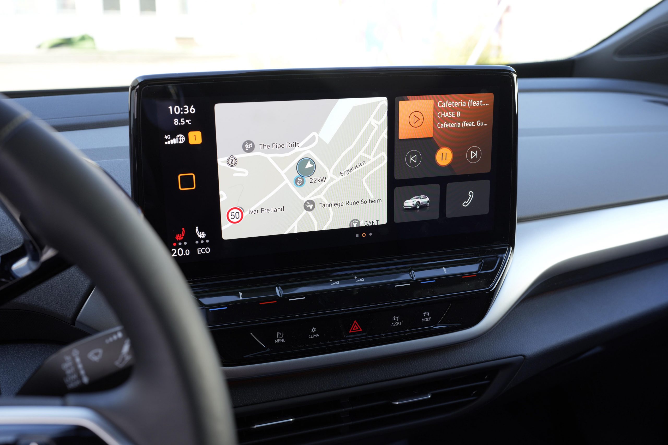 ID.4 har dessutom med VW:s egen röststyrning (som sätts igång genom att man säger ”Hello ID”), men vi blev inte särskilt imponerade av den. Vi kom faktiskt ganska så dåligt överens med Miss Volkswagen redan från början.