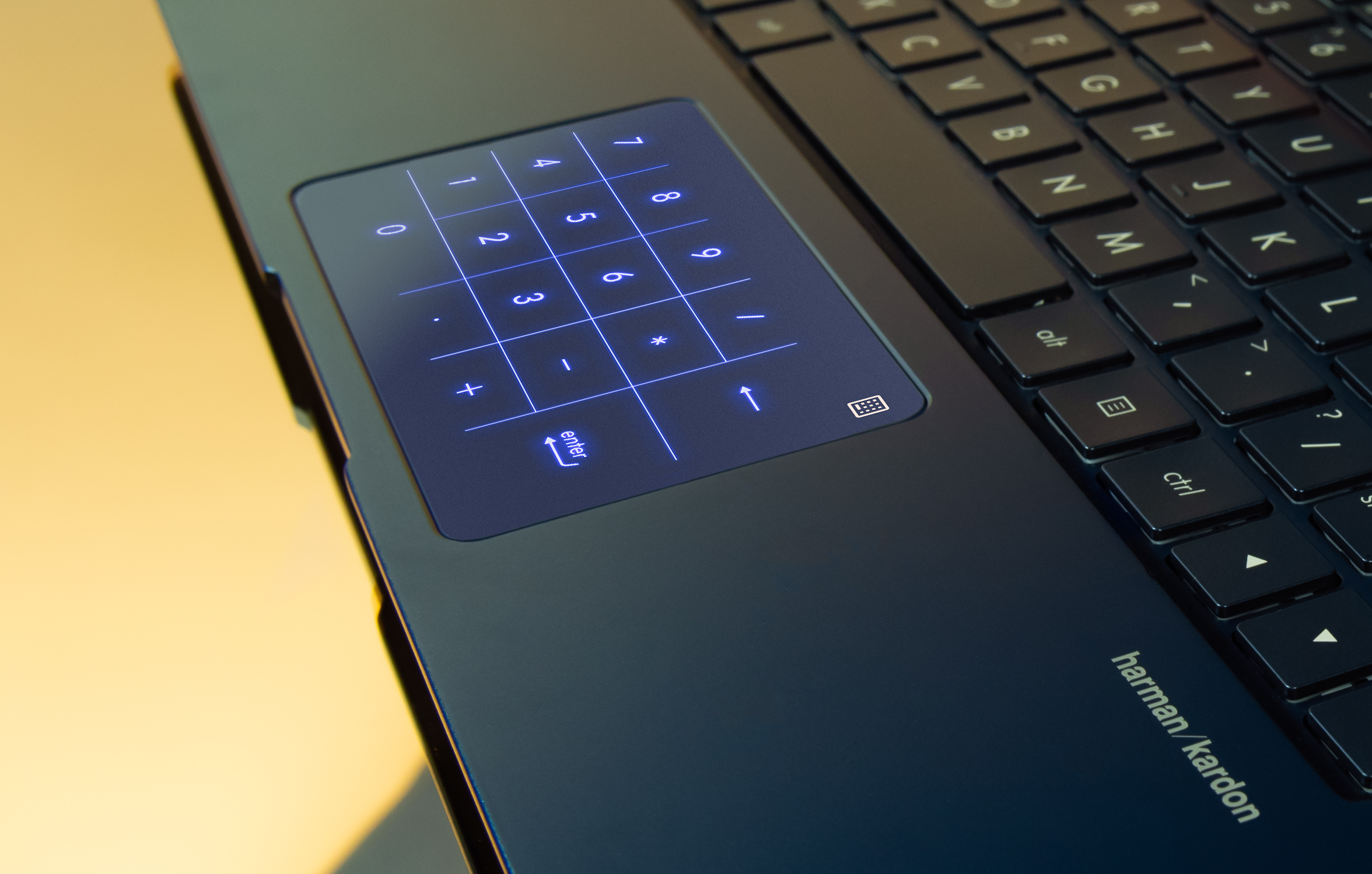 Den kompakta formen betyder att det inte finns plats för ett tangentbord av full storlek, men även om tangenterna är en aning mindre än normalt så är det fortfarande bra avstånd mellan dem och de har bra slaglängd och taktilt motstånd så att det är angenämt att skriva. Asus har till och med fått plats för ett numeriskt tangentbord – den så kallade NumberPad, som tänder ett lysande fält med numeriska tangenter på datorns pekplatta. Det fungerar överraskande bra, och det är lite coolt att man till och med kan använda pekplattan som just pekplatta samtidigt som de numeriska tangenterna visas. Det är bara en fråga om fingerfärdighet.