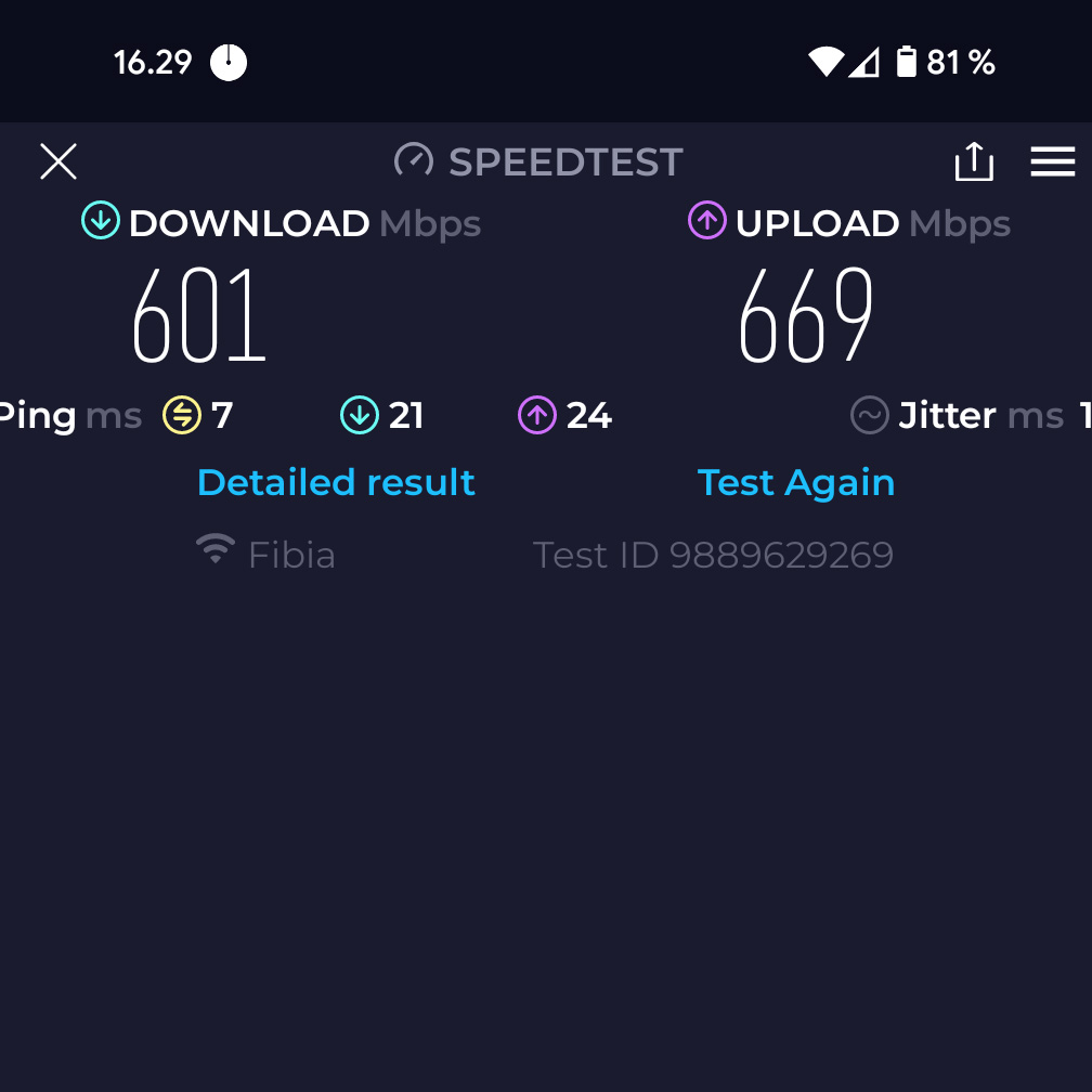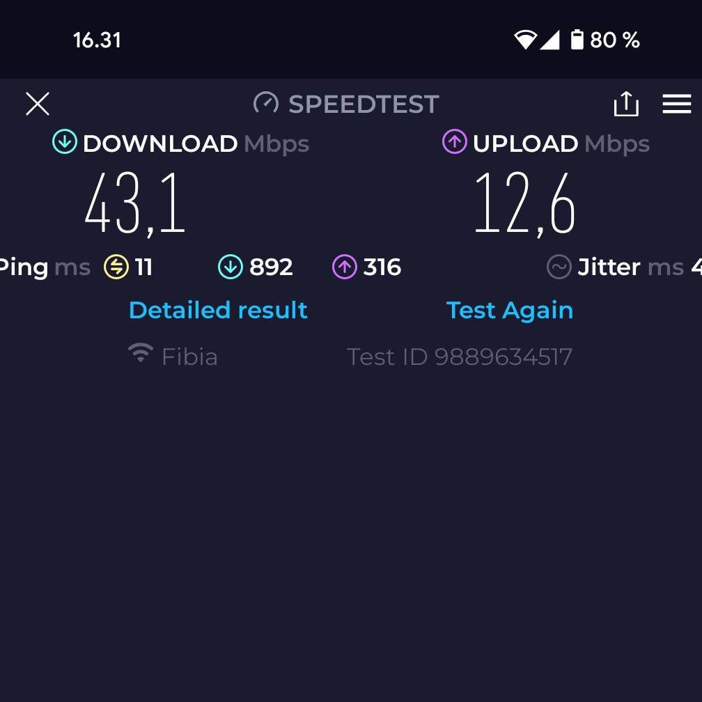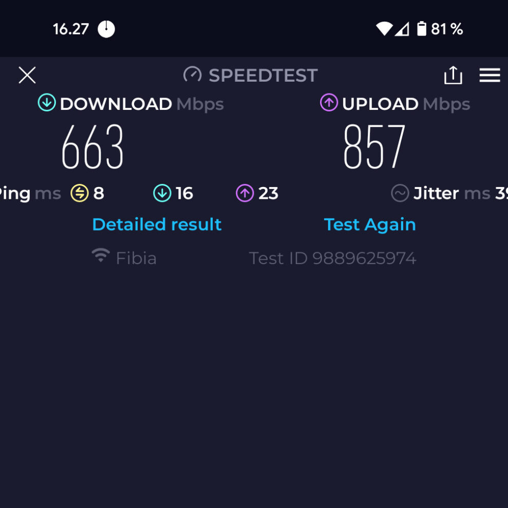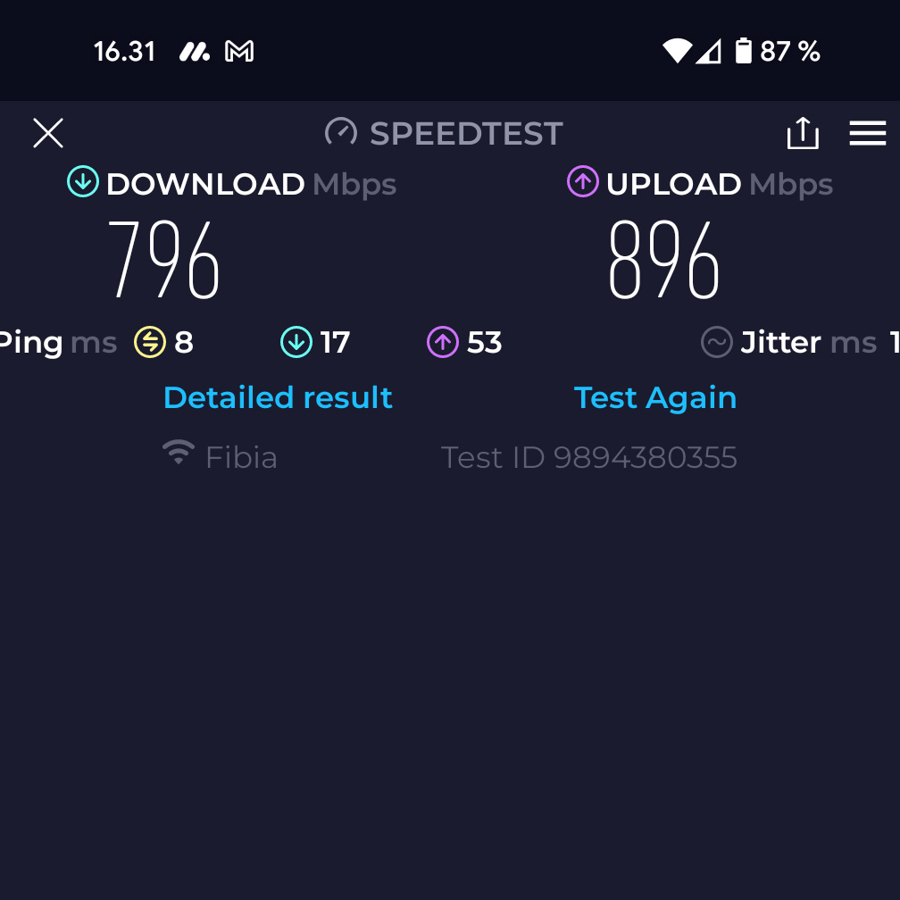 I köket, som ligger närmast vardagsrummet men bakom en tegelvägg, uppmättes en nedladdningshastighet på 519 Mbit/s och en uppladdningshastighet på hela 703 Mbit/s. Det är riktigt bra!
