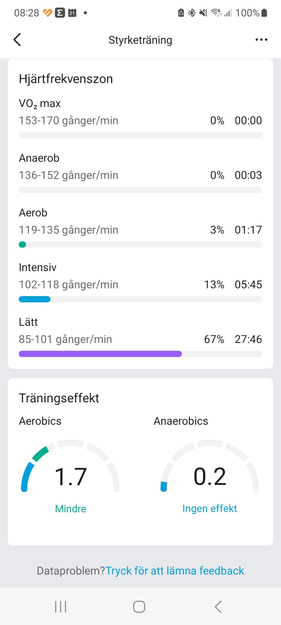 När jag sover håller armbandet koll på min sömnkvalitet och när jag vaknar kan jag se resultatet direkt på skärmen eller gå in i appen för att se mer information och djupare analyser. Min uppfattning är att Amazfit Band 7 stämmer bra överens om hur jag själv upplever min sömn.