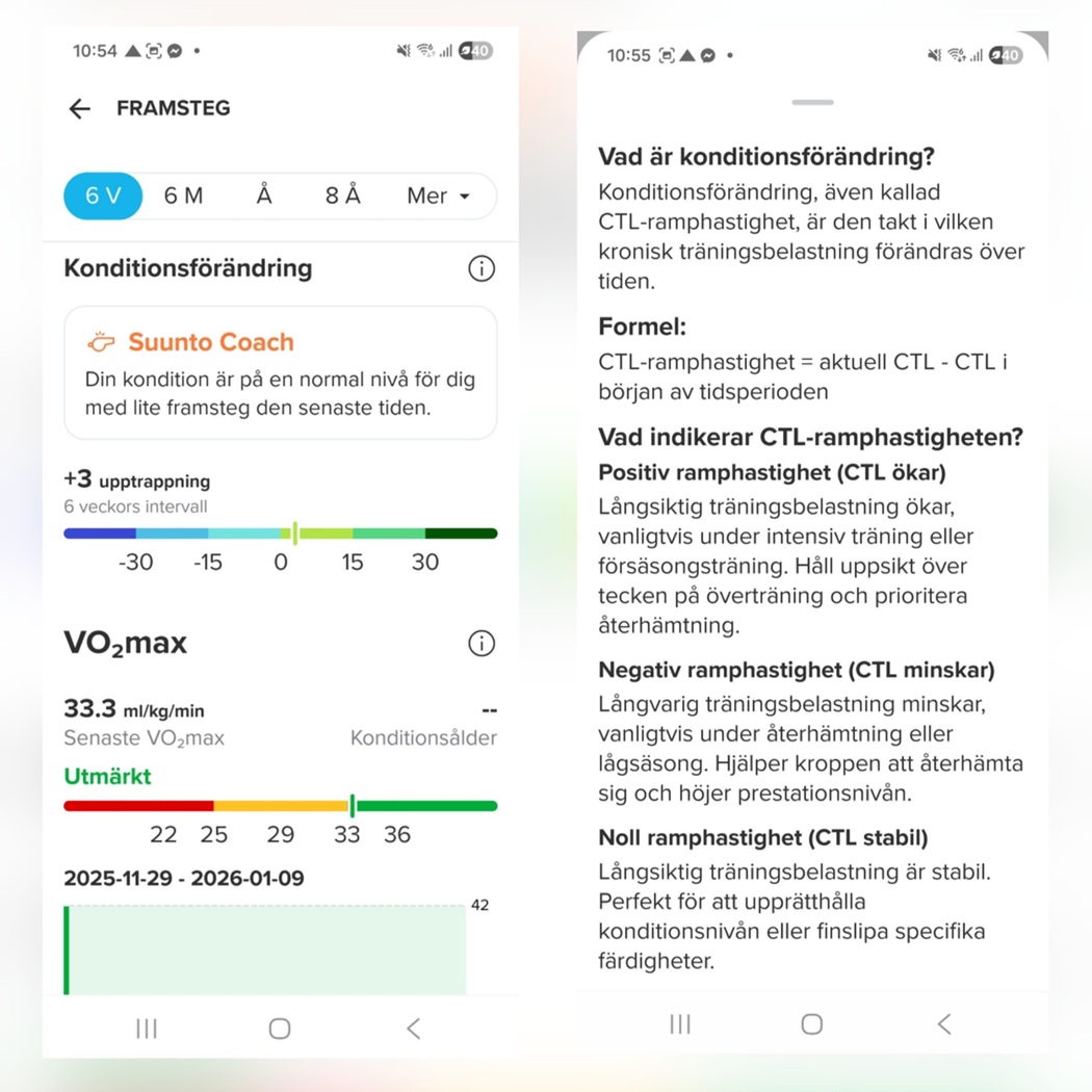 I appen kan jag bland annat utläsa min konditionsnivå och min konditionsförbättring. Här hittar jag även mer djupgående information om vad det verkligen betyder. (Skärmdump från app).