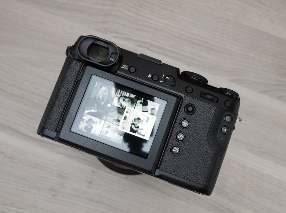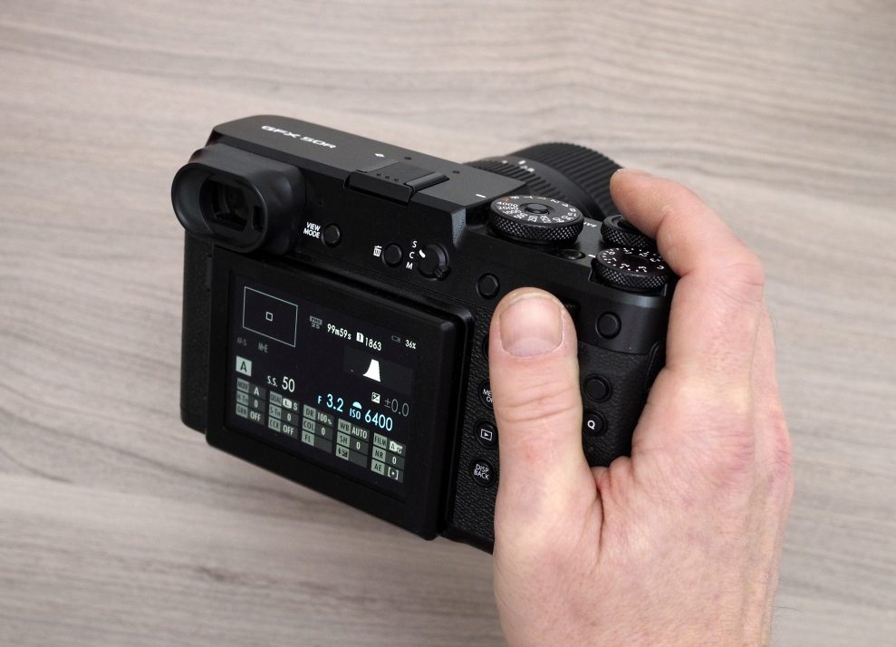 Sökaren har 0,77x förstoring, visar hela bildytan och har en upplösning på 3,7 Mp. Bildhastigheten är densamma, 3 bilder/s, och det finns en vridbar pekskärm med en styrpinne bredvid. För att flytta på fokuspunkter. Med andra ord: samma tekniska utgångspunkt som i den större och dyrare GFX 50S. Fast inpackat i ett mindre, lättare och behändigare kamerahus som är smidigare att använda handhållet och som för alla praktiska ändamål ger exakt samma extrema bildkvalitet.