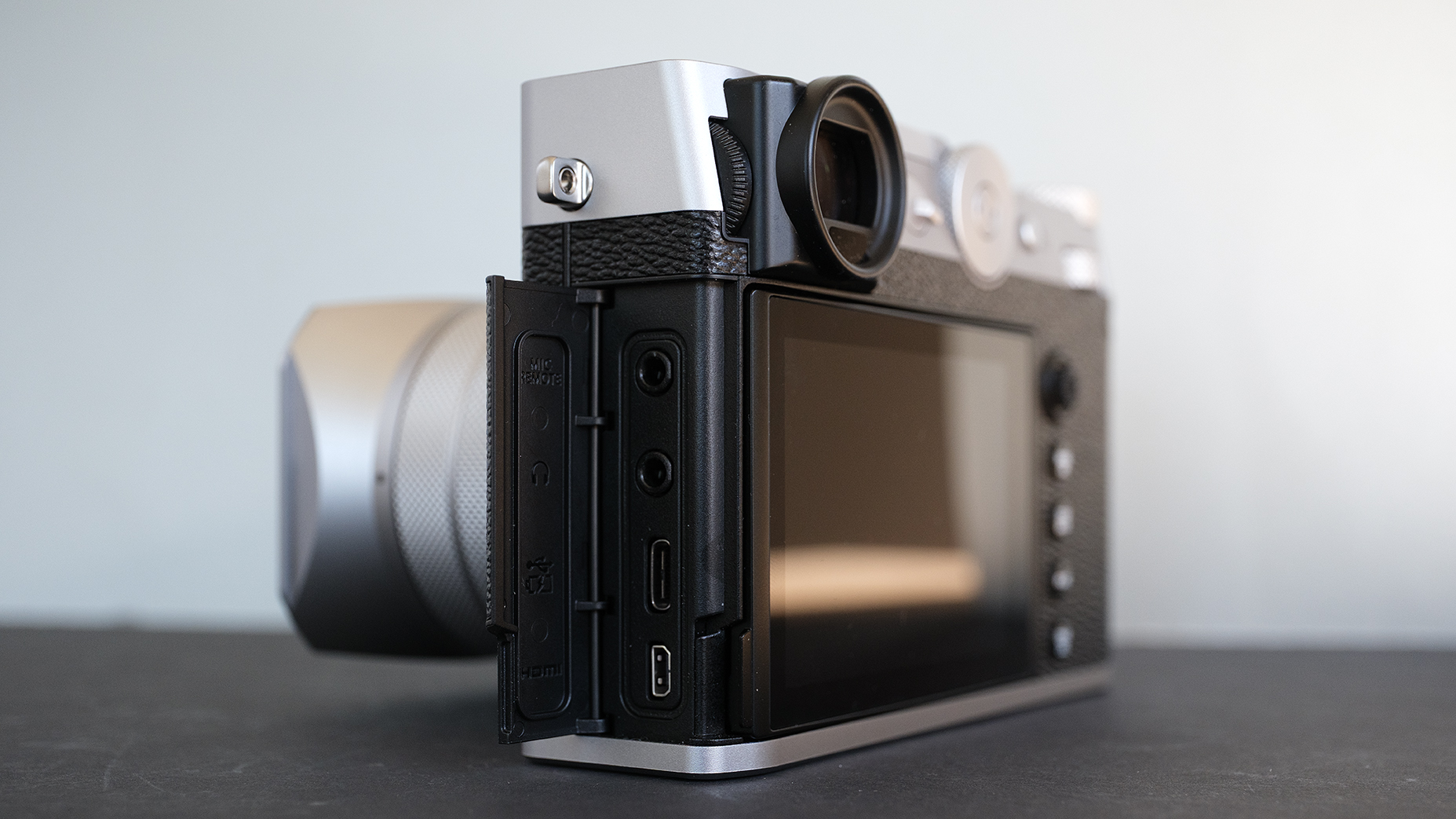 Under ett lock till vänster sitter anslutningarna för mikro-HDMI, USB-C och ingångar för fjärrkontroll, mikrofon och hörlurar. På andra sidan finns två SD-kortplatser (för UHS-II-kort) och det går att ansluta en extern SSD för lagring av 4K-video. Som kan filmas med 4K-upplösning i 30p och i 10-bitars 422 med F-log.