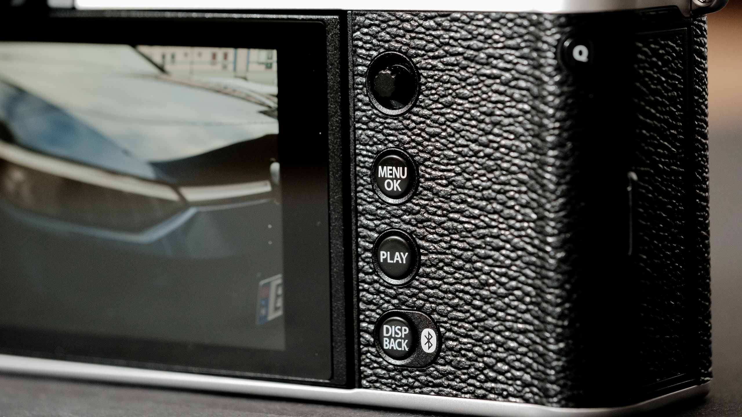 Med Q-knappen på baksidan kommer man åt snabbval på pekskärmen och Fujifilm har lyssnat på kritiken mot föregångarens något långsamma bländarring. Här är den mycket mjukare, med markerade klickstopp för varje bländare. Det finns inget lås på hjulet för exponeringskompensation här heller, så man får hålla ett öga på vilket ev-värde den är inställd på.