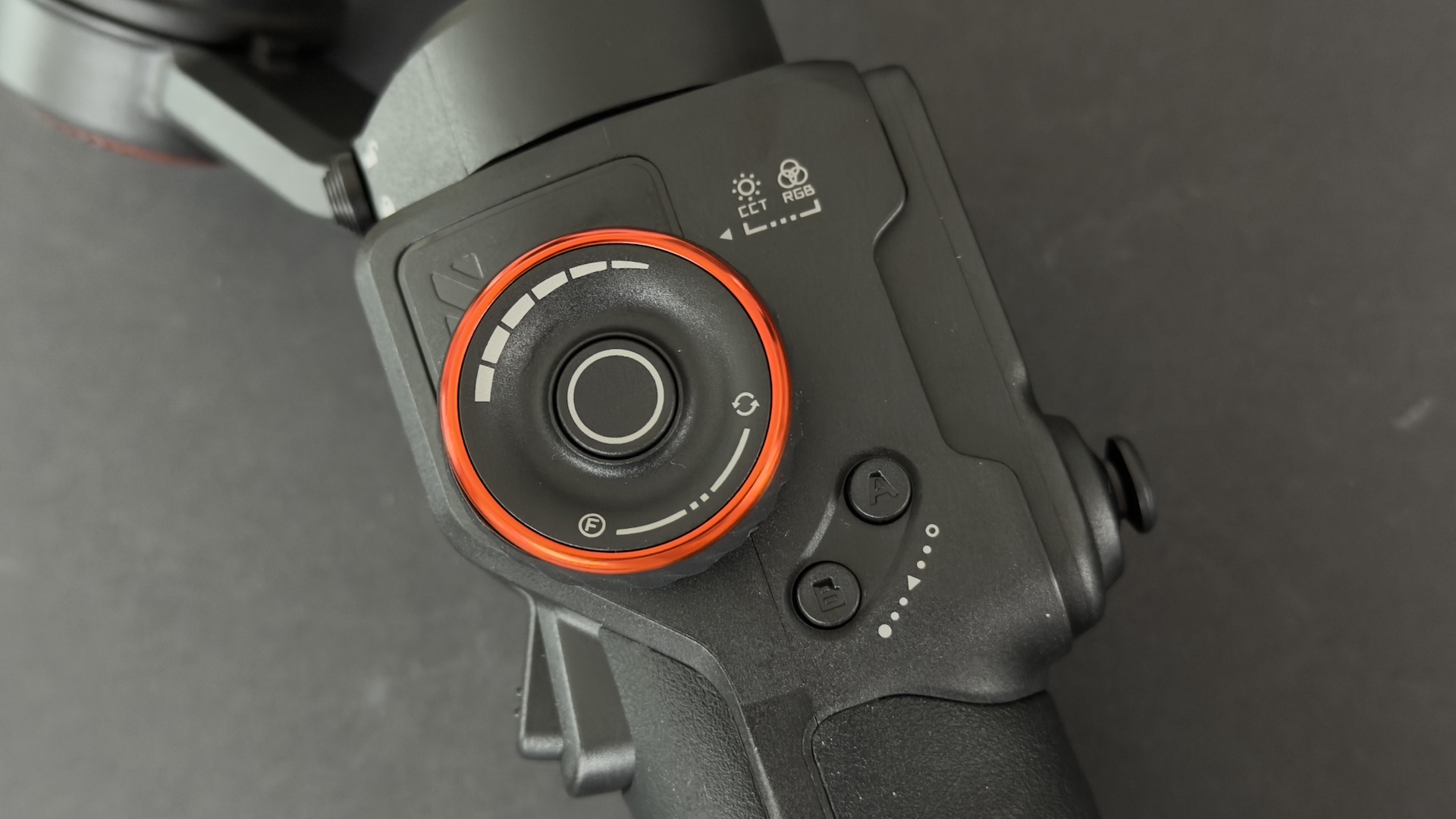 På sidan av handtaget sitter ett programmerbart inställningshjul. Man kan själv välja fokus, zoom, tilt – vad nu det ska vara bra för – och ställa in LED-ljuset till CCT eller RTB, samt välja ljusstyrka och färgtemperatur själv.