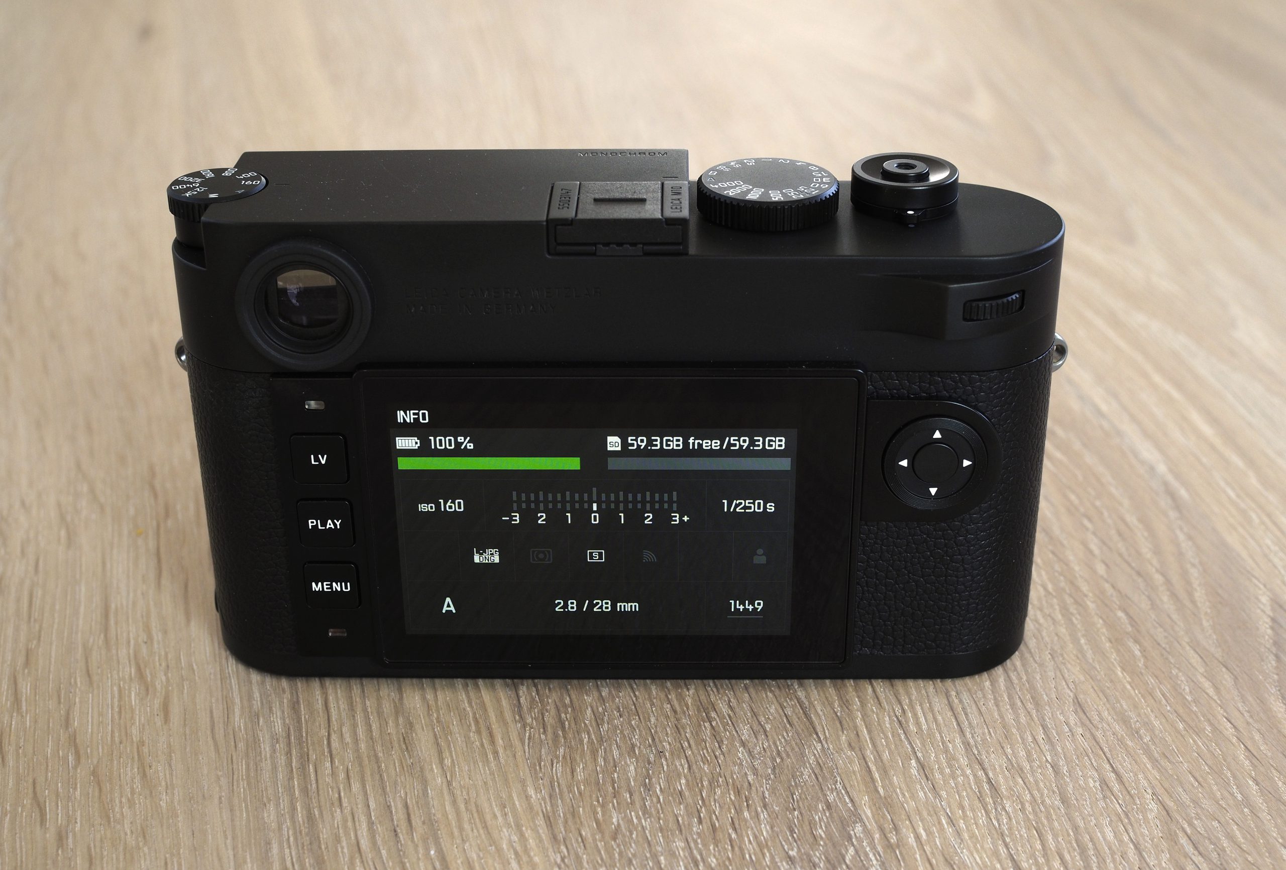 I övrigt är kamerahuset tämligen identiskt med en Leica M10 med färgfilter på bildsensorn. Man får live-view på en pekskärm med medelmåttig kontrast och upplösning och det finns nästan inga knappar på kameran. Åtminstone inte jämfört med vanliga digitalkameror. Om sanningen ska fram så har det egentligen inte hänt så mycket med ergonomin i Leicas M-kameror sedan M3 från 1953.