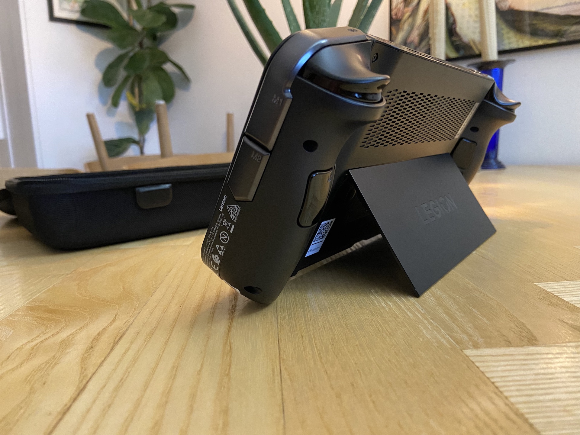 På baksidan av Legion Go finns också ett kraftigt utfällbart stativ så att skärmen kan stå på egen hand. Något du förmodligen kommer att behöva, eftersom den är kännbart tung när man lyfter ut den ur den medföljande transportväskan. 854 gram låter inte mycket, men det är nästan 250 gram mer än Asus ROG Ally, vilket gör skillnad om man ska hålla den i händerna under en längre tid.