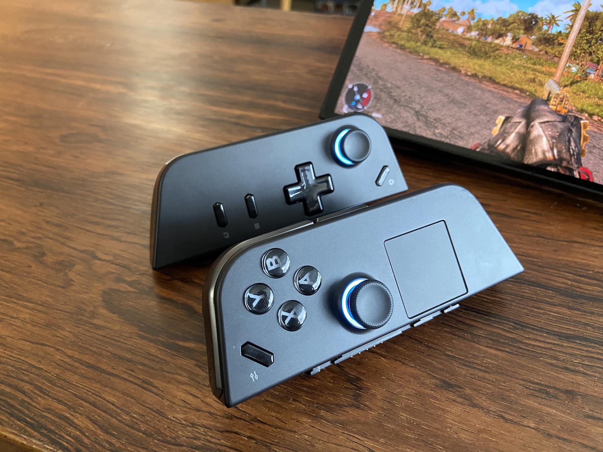 Den andra delen av designen är kontrollerna, som är avtagbara och sitter på sidan av det stora höljet med skärmen. På dem hittar du RGB-belysning och en myriad av knappar i en asymmetrisk uppsättning. Och det betyder inte bara att kontrollpinnarna är asymmetriska som på en Xbox-kontroller. Nej, det finns en skillnad i både hur många knappar varje handkontroll har och var de är placerade.