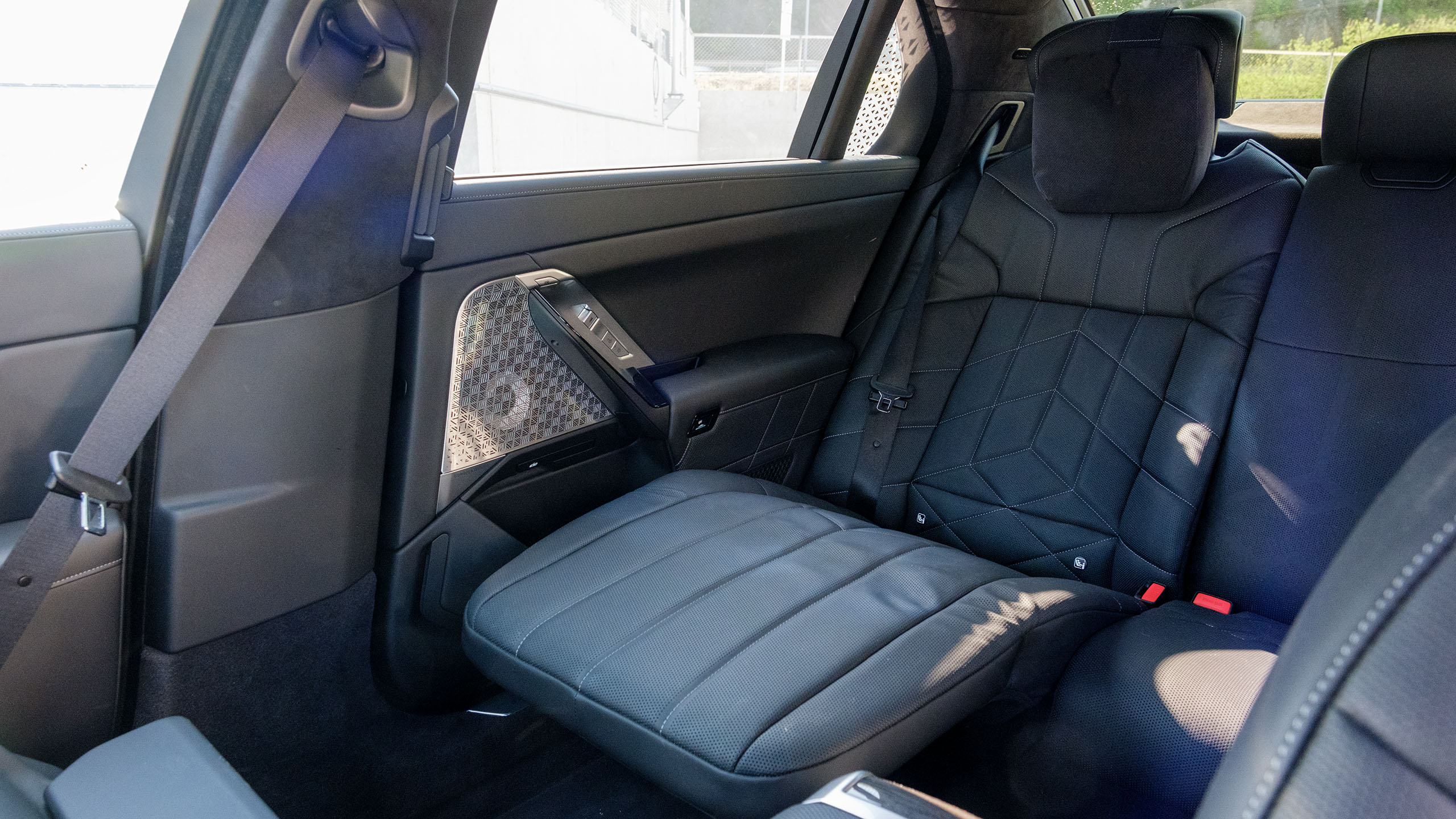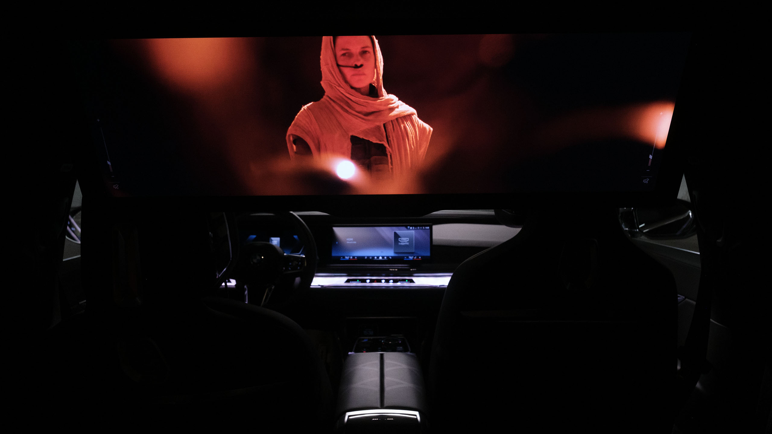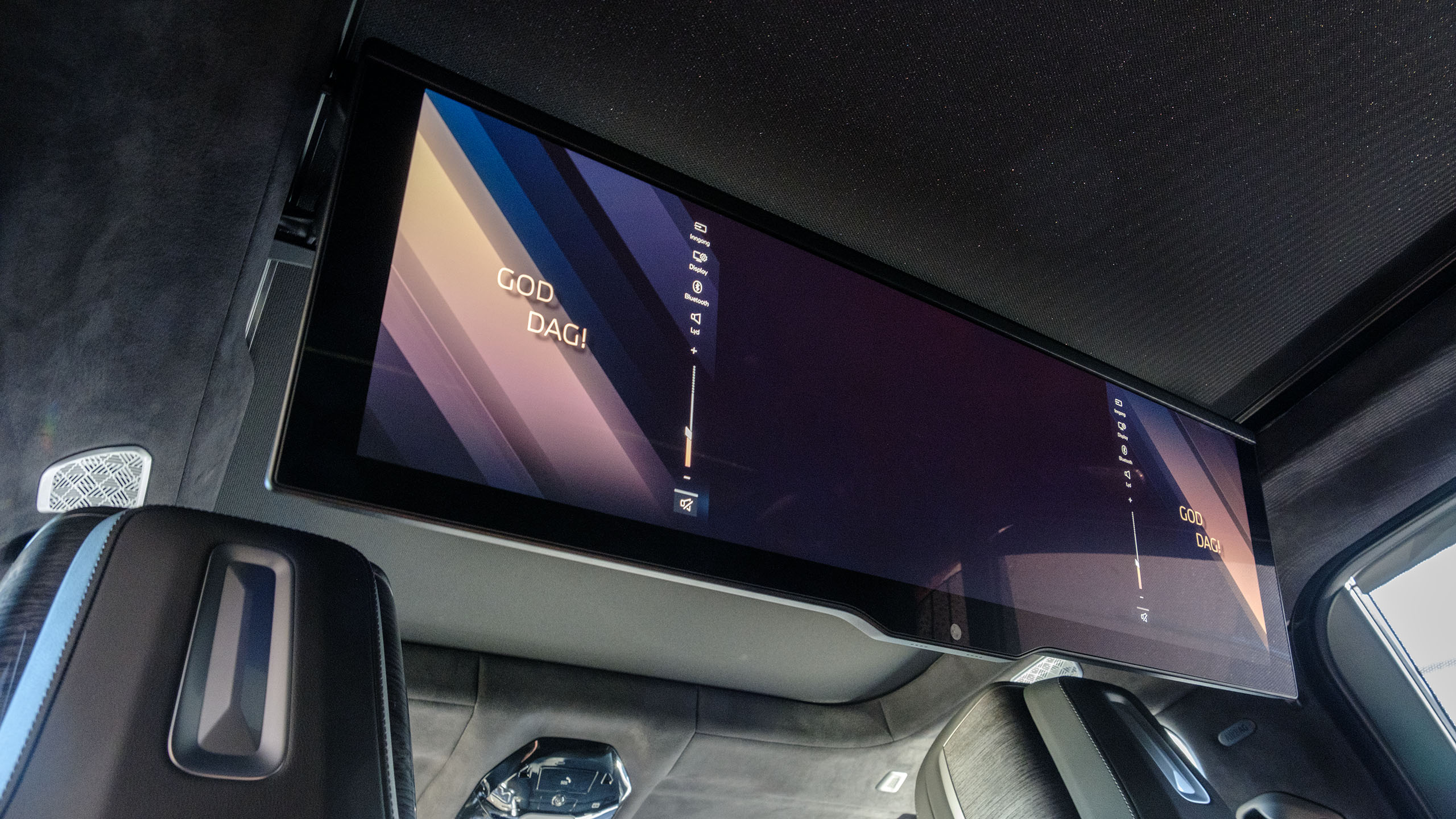 Att sitta i baksätet när till exempel Dune rullar över skärmen är en upplevelse man inte får i någon annan bil än BMW i7. Vissa kommer att tycka att sittställningen är lite sned eftersom skärmen hänger i taket och inte kan fällas ner framför ansiktet. Men den kan vinklas och skjutas fram och tillbaka tills man hittar en vinkel och ett avstånd som är bekvämt.