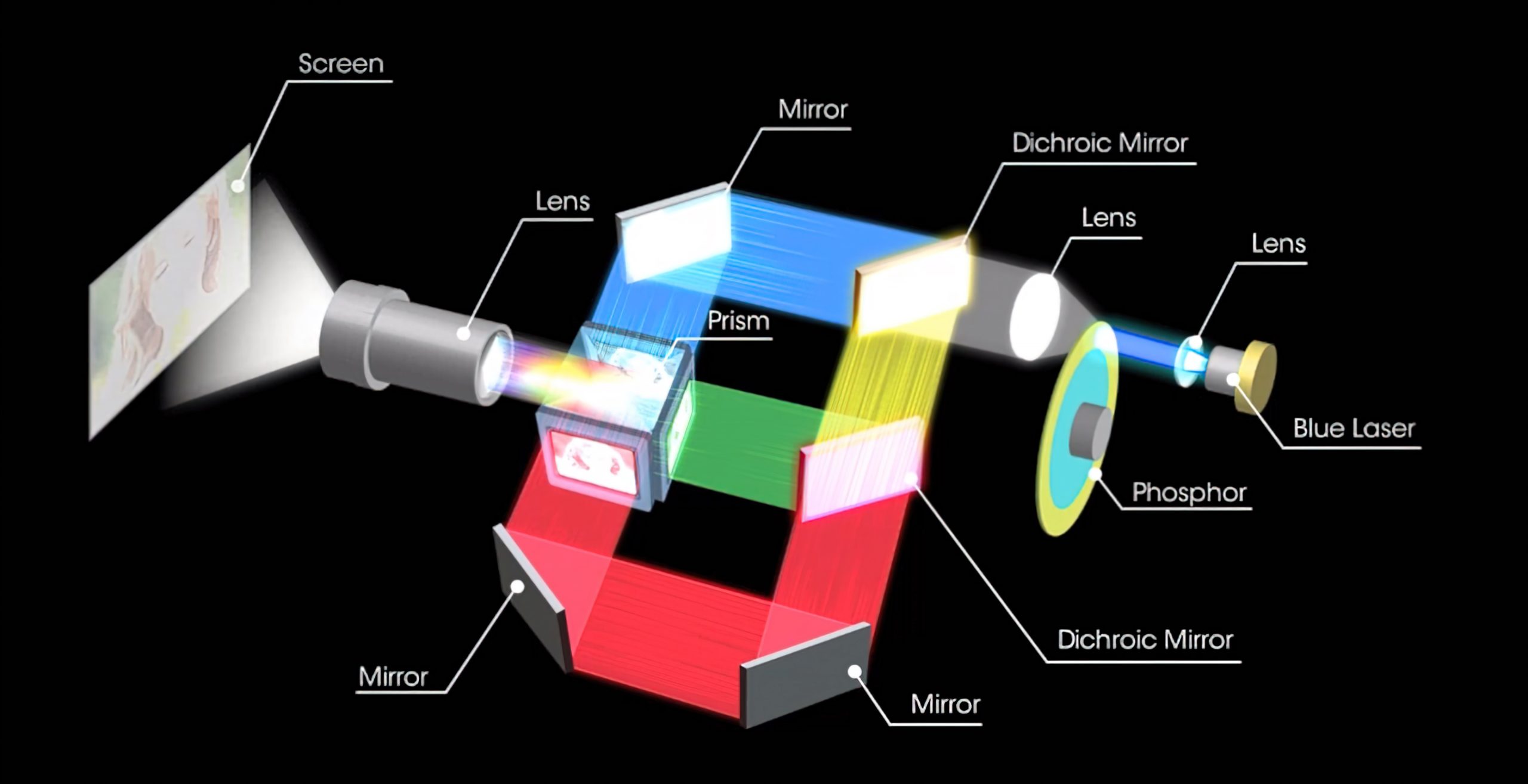 Sony kallar lasern för Z-Phosphor, som är ett blått laserljus. När det lyser genom ett färgfilter delas ljuset upp i de tre primärfärgerna röd, grön och blå. Det är en betydligt effektivare ljuskälla än en vanlig lampa, vilket ger mer tryck i ljuset, och färgbalansen håller sig dessutom stabil oberoende av ljusstyrkan.