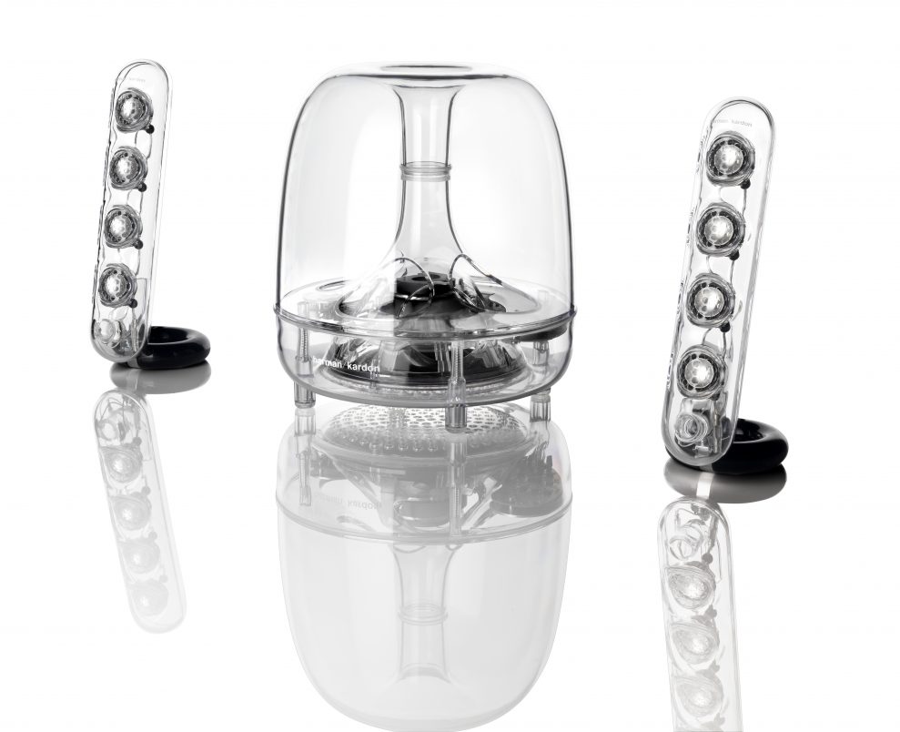Med Soundsticks II ersattes USB av vanlig 3,5 mm-plugg. För Harman Kardon Soundsticks III är uppdateringen mer subtil. Satelliternas fot har blivit svart för att matcha MacBook, sladdarna har blivit tåligare och belysningen är vit istället för blå. Vi är fortfarande väldigt förtjusta i utseendet och det är få högtalare som kan få besökare att stanna och fråga vad det är för något. Det är dock kanske lite onödigt med den akvarieliknande subwoofern under skrivbordet.