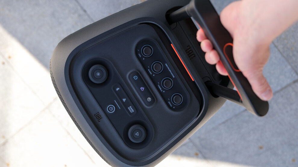 JBL PartyBox Stage 320 är som en stor Club 120, fast med mer av allt. Vikt också. Högtalaren är 13 cm högre och 5 cm bredare, men som tur är har den ett teleskophandtag precis som på en resväska, vilket gör den lättare att hantera.
