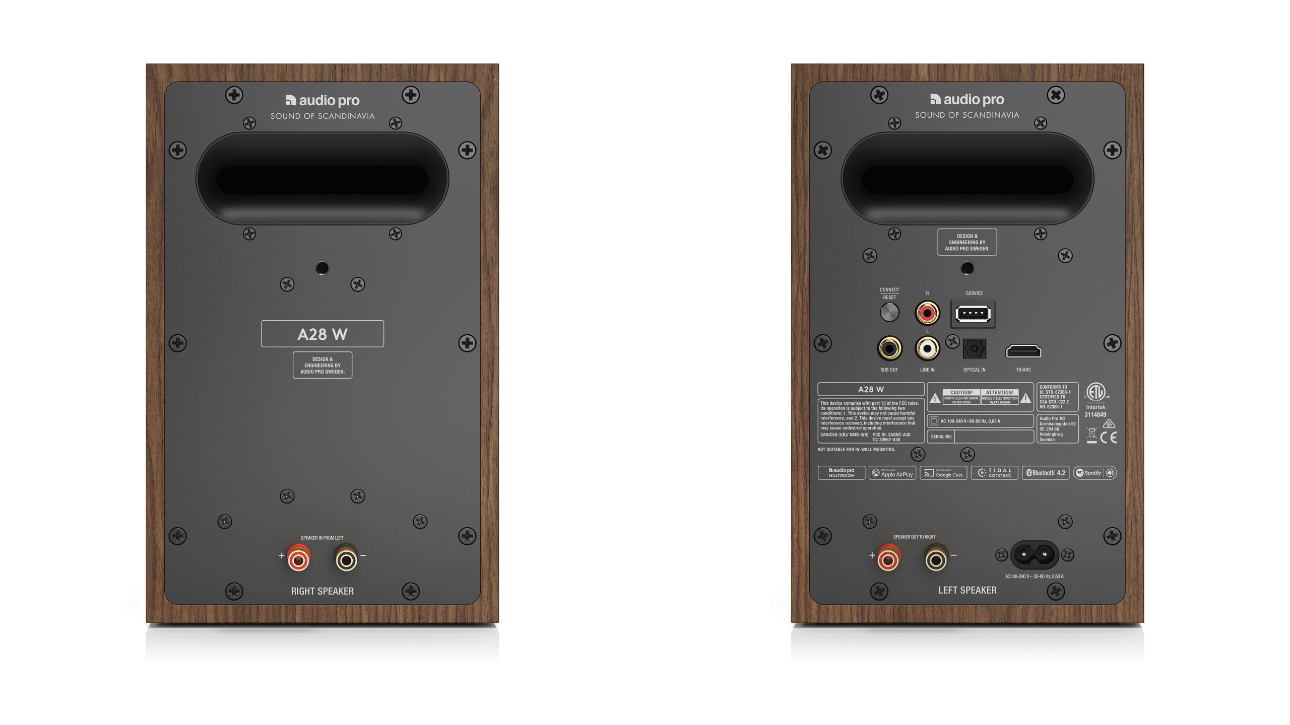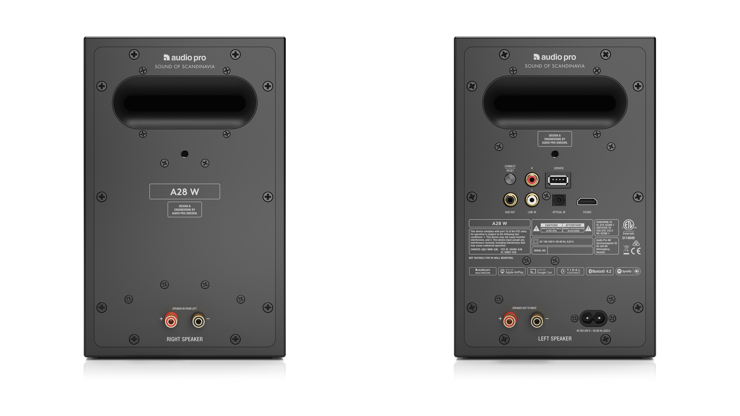 Konstruktionsmässigt finns det inget nytt under solen. A28 W levereras som stereopar, där all elektronik sitter i den vänstra högtalaren, som sedan driver den högra via en kabel.