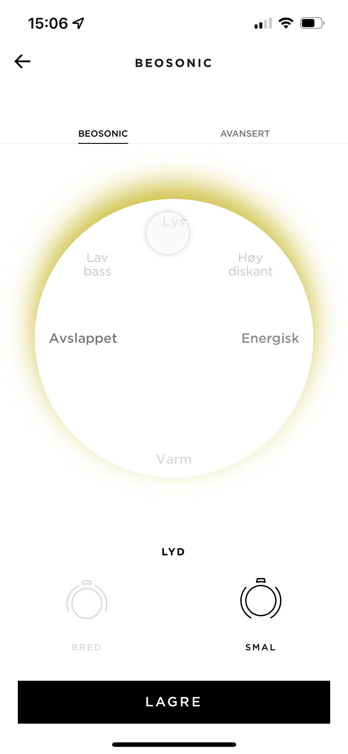 En sak till. Högtalarnas motoriserade träribbor kan ställas i två lägen när man spelar musik. Narrow Mode drar ribborna längre fram och koncentrerar ljudet riktning mot lyssnaren, medan Wide Mode drar dem bakåt och sprider ljudet i ett bredare mönster för att göra ljudbilden större. Det sidomonterade högtalarelementet delas då högre upp i frekvens, så att det får ett bredare frekvensområde.
