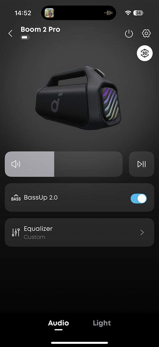 Vill man ha ännu mer ös så trycker man på BassUp-knappen på toppen av högtalaren, som är stänkskyddad och flyter i vatten. Perfekt för båtfolk, med andra ord. Den har dessutom ett integrerat bärhandtag och levereras med en axelrem. Trots storleken gör den låga vikten att stora Boom 2 Pro är mycket bärbar.