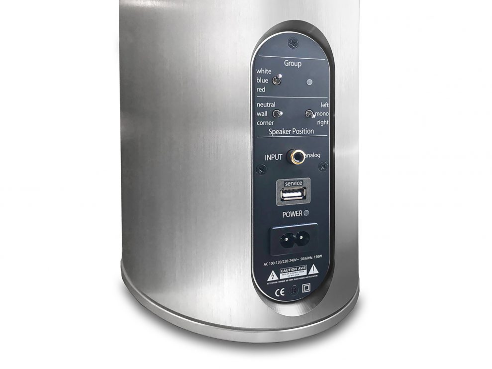 På baksidan hittar man strömanslutning, ingång för Connect-boxens ljudutgångar och tre omkopplare. Den översta talar om för högtalarna vilken av tre grupper de tillhör (röd, vit, blå). De kan nämligen grupperas efter vilka rum som ljudet ska distribueras till.