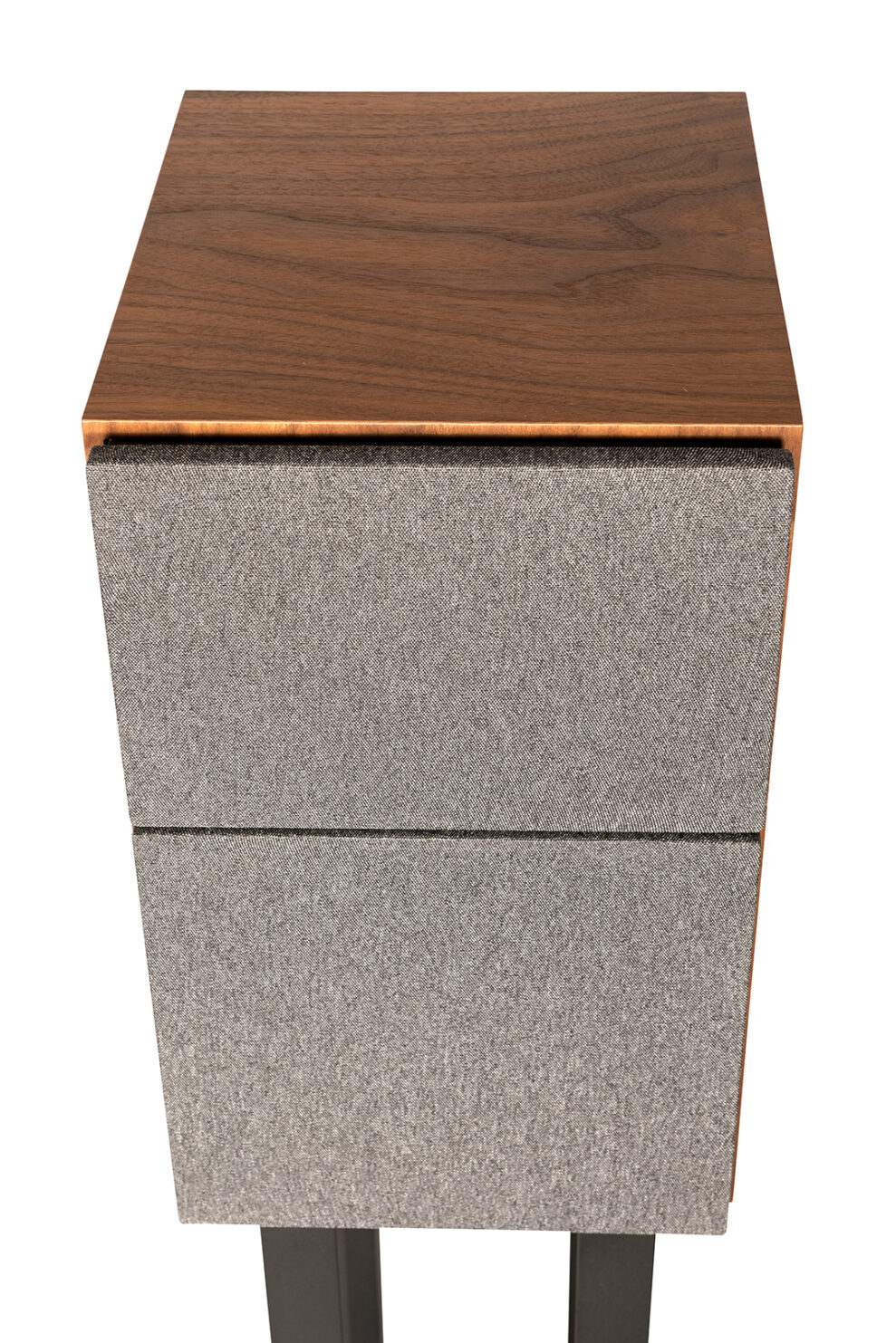 Utsidan är minst lika läcker som insidan. Kabinettet är fanerat med valnöt, vilket i sig är ett nöje att titta på. En inlagd horisontell rand och logga i ett annat träslag gör intrycket extra raffinerat. Om man inte vill se de snygga högtalarelementen kan man dölja dem bakom tygfronten som är tudelad och sätts fast med magneter.