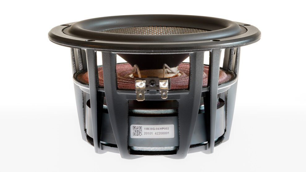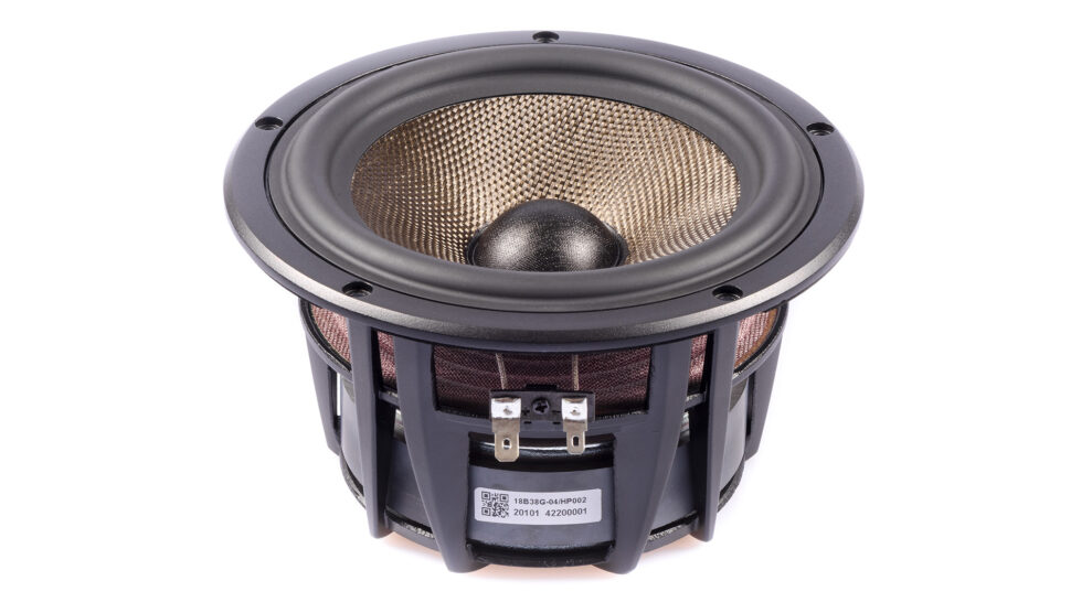 Bas/mellanregisterelementet är på sju tum och gjort av ett svartbrunt vävt fibermaterial som visar sig vara tillverkat av vulkanisk basalt som har smälts och spunnits. Membranet är en sandwichkonstruktion med filt på baksidan. Elementet är dessutom utrustat med en av de största och mest potenta magneter jag har sett på en sjutummare.