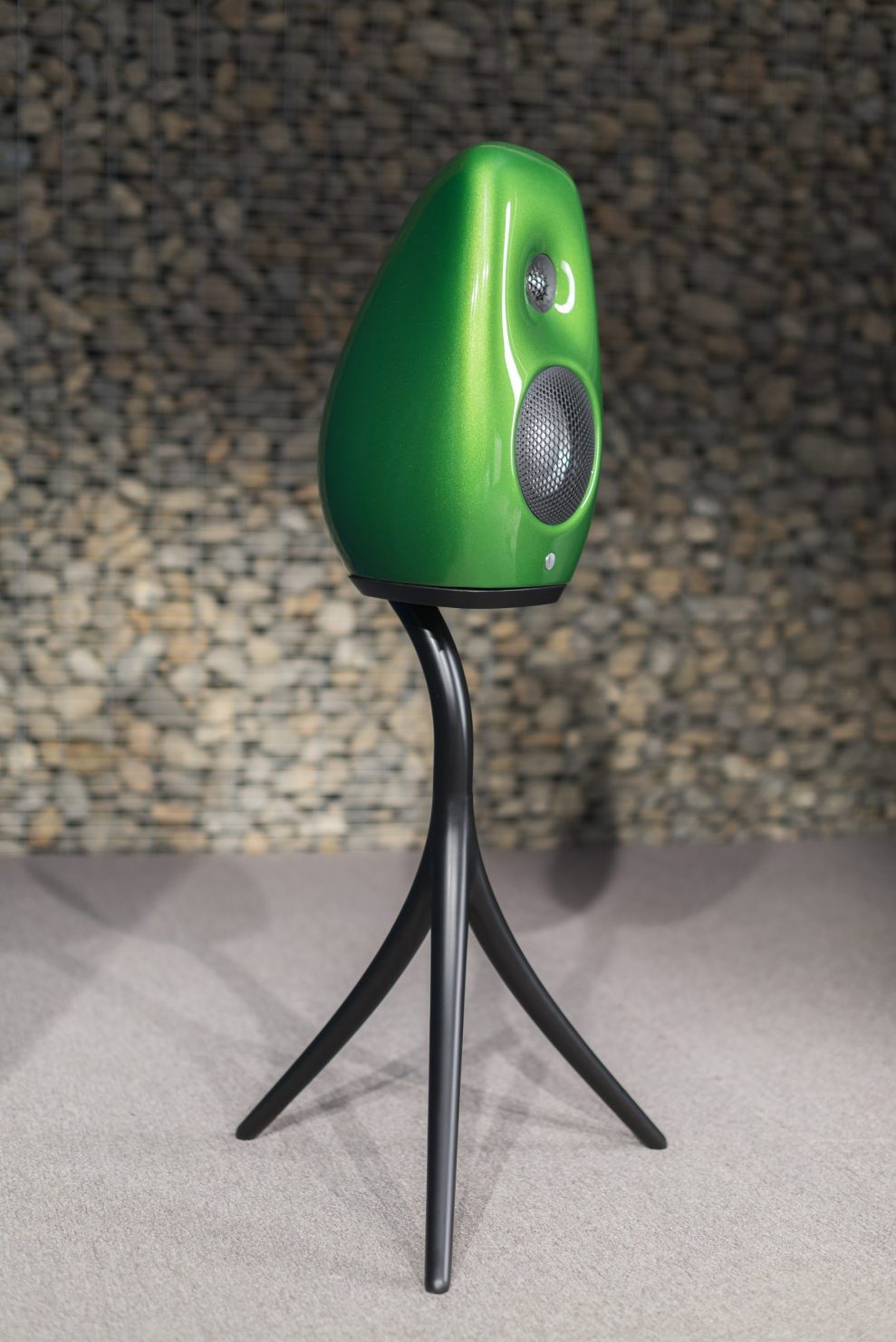 Det finns inga parallella ytor på insidan av kabinettet, som har en neutral matt metall som standardfärg – andra färger i valfri billack kostar extra. Den yttre ytan är mjukt rundad på ett sätt som gör den till en ”oändlig baffel”. Det förhindrar oönskade resonanser och dessutom diffraktioner – speciellt i diskantfrekvenserna – när ljudvågor färdas längs ytan på utsidan av kabinettet.