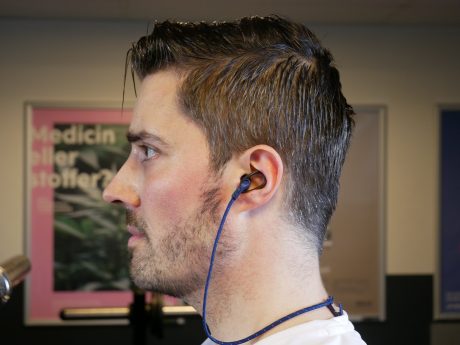 De små silikonpropparna har en avlång ögla som spänner fast i örat. Först känns de lite lösa, men sitter faktiskt riktigt skönt.