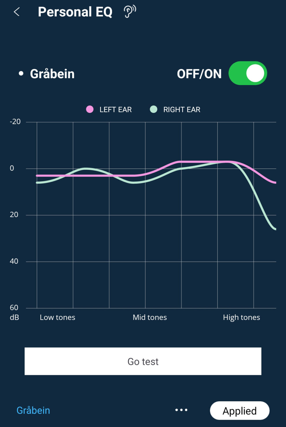 Det fungerar, men jag upptäckte en nackdel: när systemet justerar olika EQ för vänster och höger öra så påverkas fasåtergivningen och därmed stereoperspektivet. Ljudbildens annars så precisa centrum ersätts av en vag dimma. Jag saknar möjligheten att välja en kompromiss med lika EQ för båda öronen, baserat på genomsnittet mellan höger och vänster öra.
