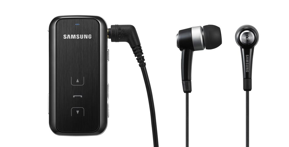 Liksom många andra lösningar för öronproppar i det här testet använder Samsung en liten dosa som man ska fästa i kläderna. Desto ovanligare är att den är konstruerad för att sitta upprätt vilken nästan kräver att man har en bröstficka. Eller så använder man halsremmen och har den som ett smycke runt halsen. Klämmer man fast den i någon annan riktning så riktas mikrofonen bort från munnen. Trots att ytbeläggningen försöker ge intryck av borstad metall så är den i själva verket byggd i plast av medelgod kvalitet.