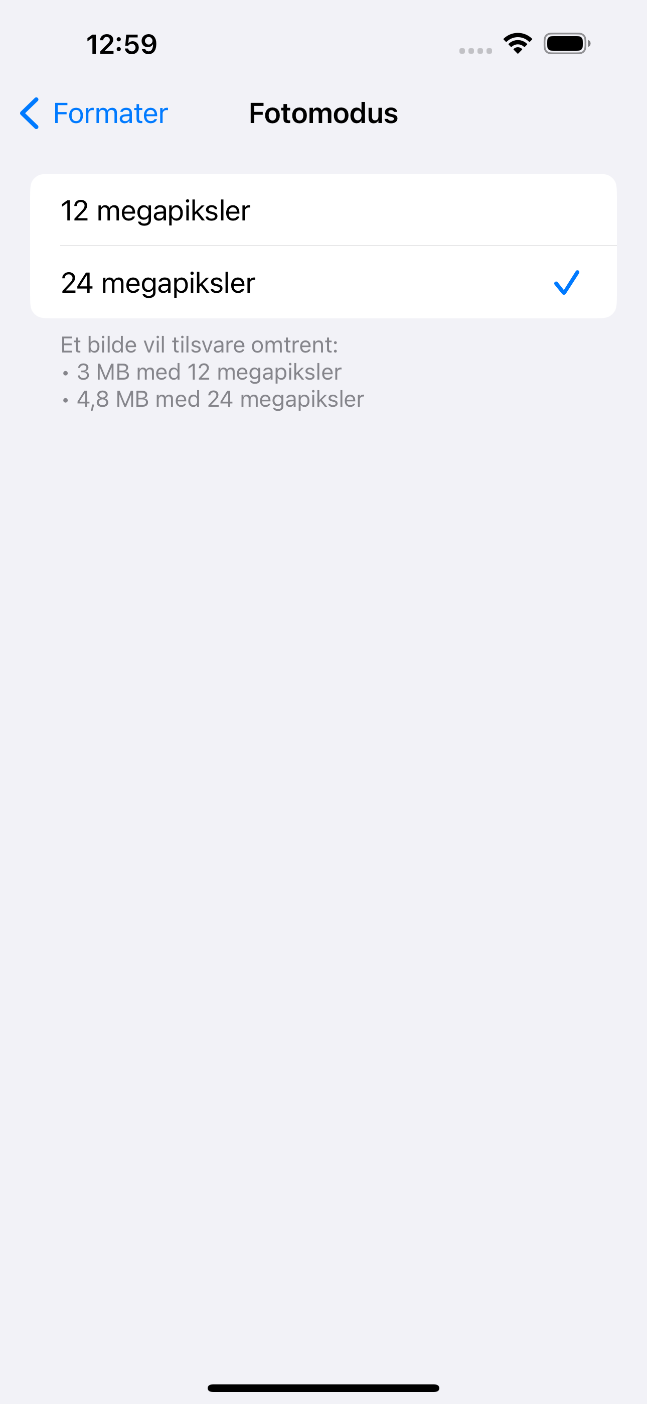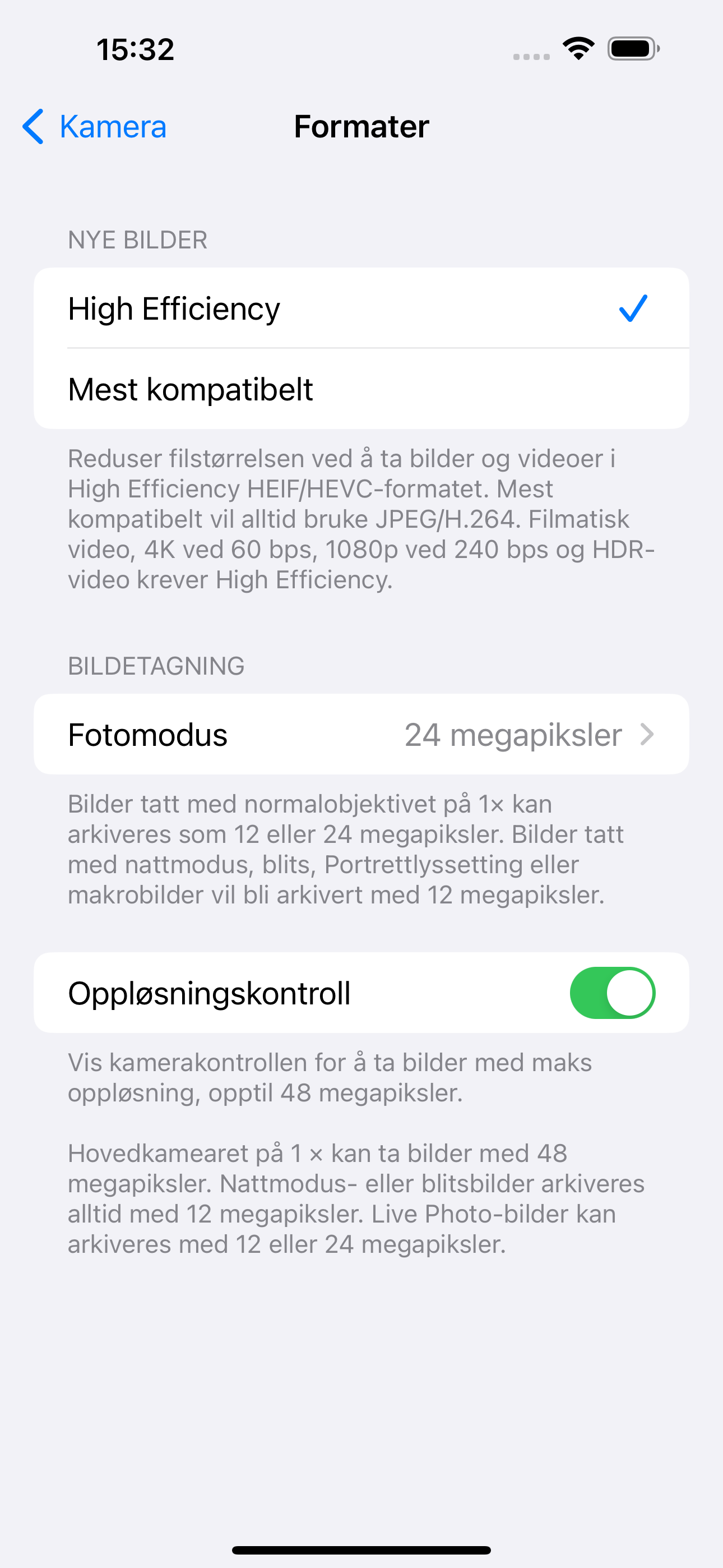 När det finns tillräckligt med ljus väljer kameran 24 Mp för högre upplösning och skarpare detaljer. Går man in i kamerainställningarna kan man välja Upplösningskontroll. Då kan kameran ta bilder med en upplösning som motsvarar 48 Mp.