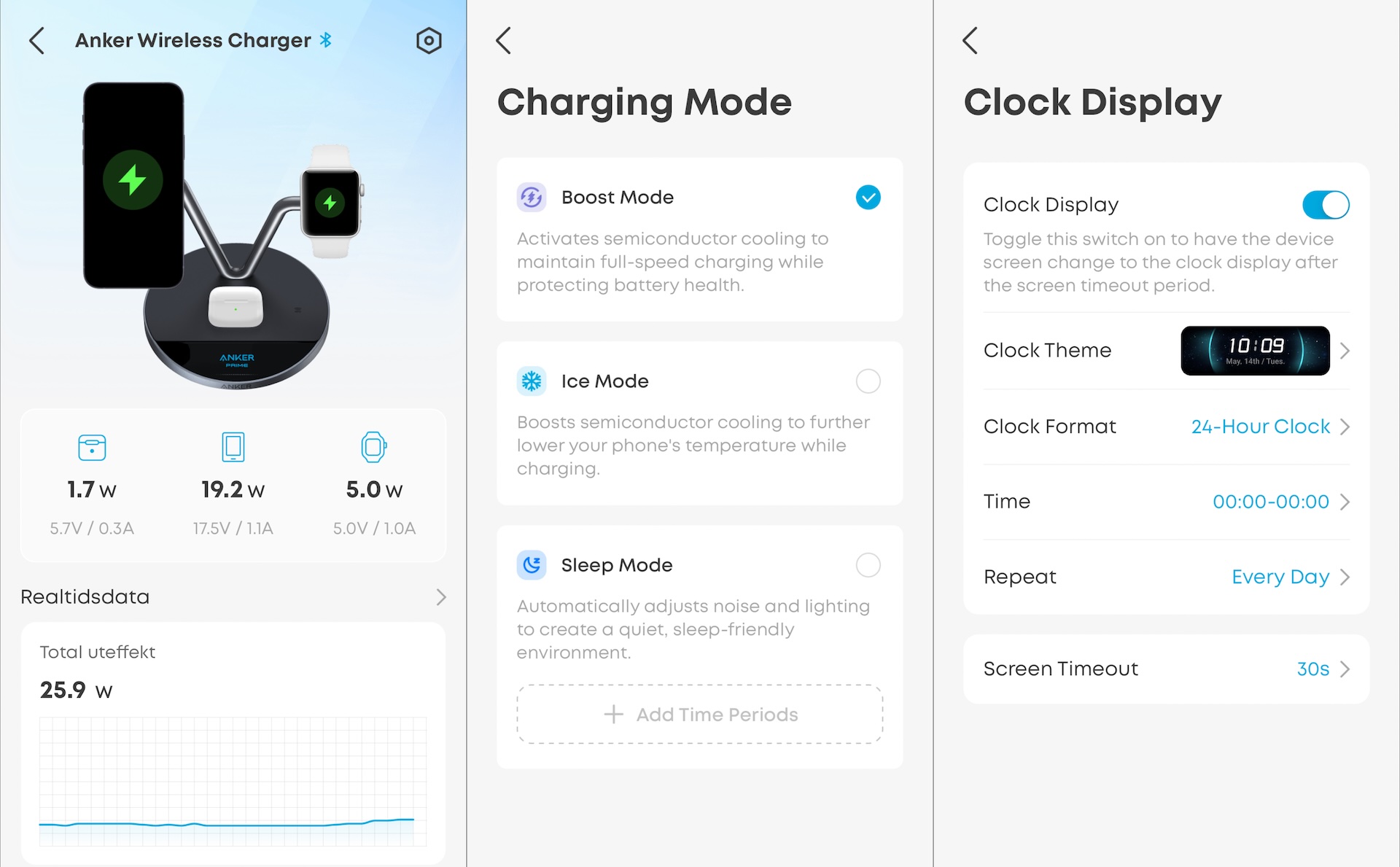 Det som verkligen skiljer Anker Prime från de andra deltagarna i testet är hur mycket teknik de byggt in. Den har en touchskärm som visar laddningseffekt för de tre enheterna samt kan visa klocka och datum när den inte används. Men framför allt kan man ansluta den med Bluetooth till Anker-appen. Därifrån kan man inte bara se laddningseffekterna utan även en graf över laddningen, för den riktigt nördiga. Man kan även välja tema och inställningar för skärmen, samt välja kylningsnivå. Detta kan även göras från touchskärmen. Nivåerna är extra kylning, normal eller ett tyst nattläge.