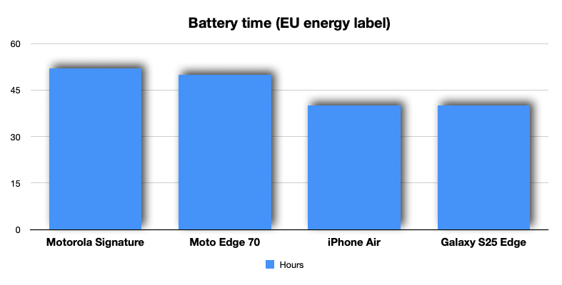 Tack vare att batteriet använder den moderna Kisel-Kol-tekniken och den större kapaciteten klår Motorola Signature lätt Galaxy S25 Edge, för att inte tala om den usla iPhone Air. Den är även bättre än Motorola Edge 70, men där är inte skillnaden lika stor. Det är dock ingen magi inblandad så den får se sig slagen av Honor Magic8 Pro och OnePlus 15 som tack vare sin större storlek klämt in batterier på över 7 000 mAh.
