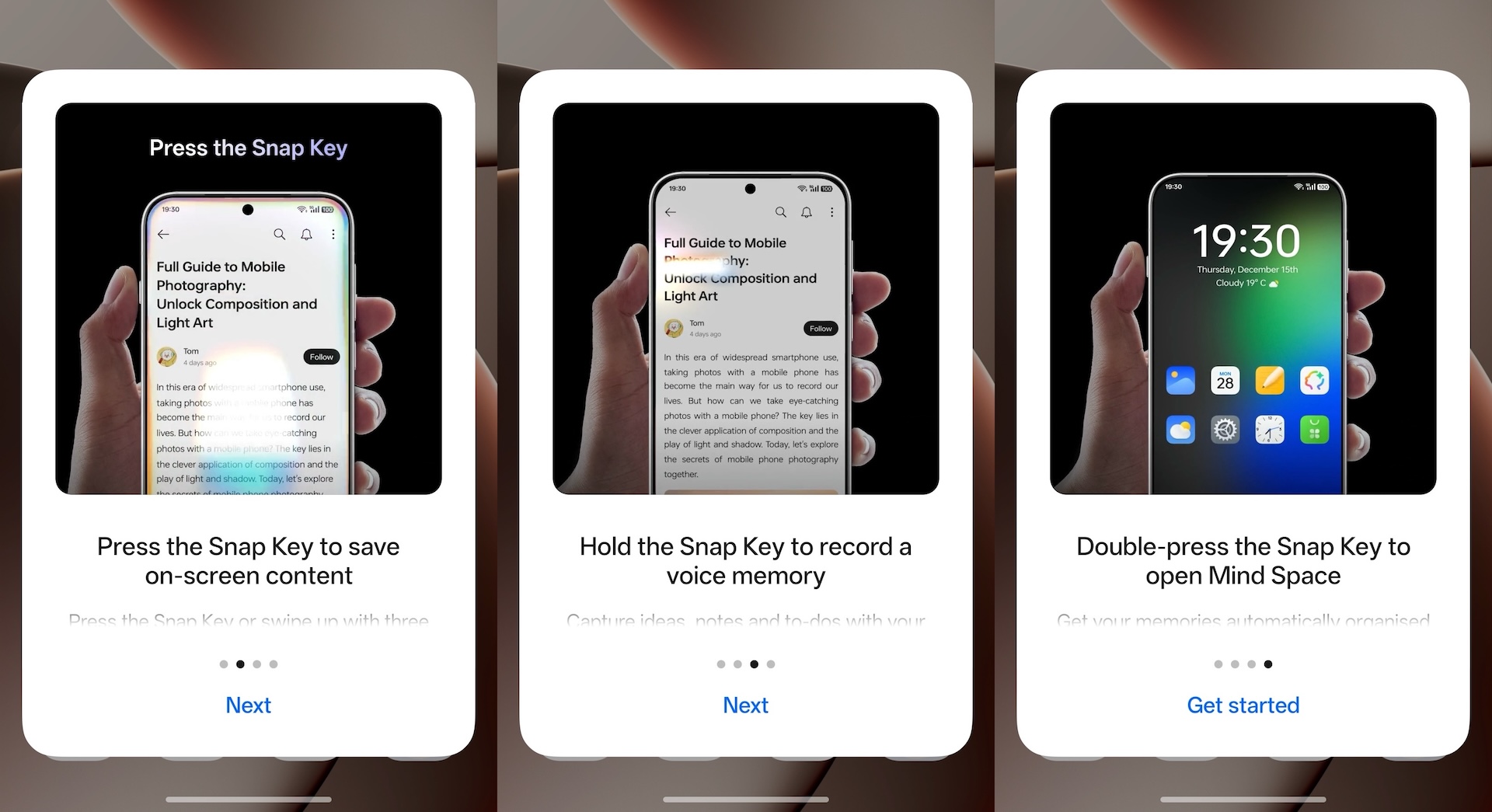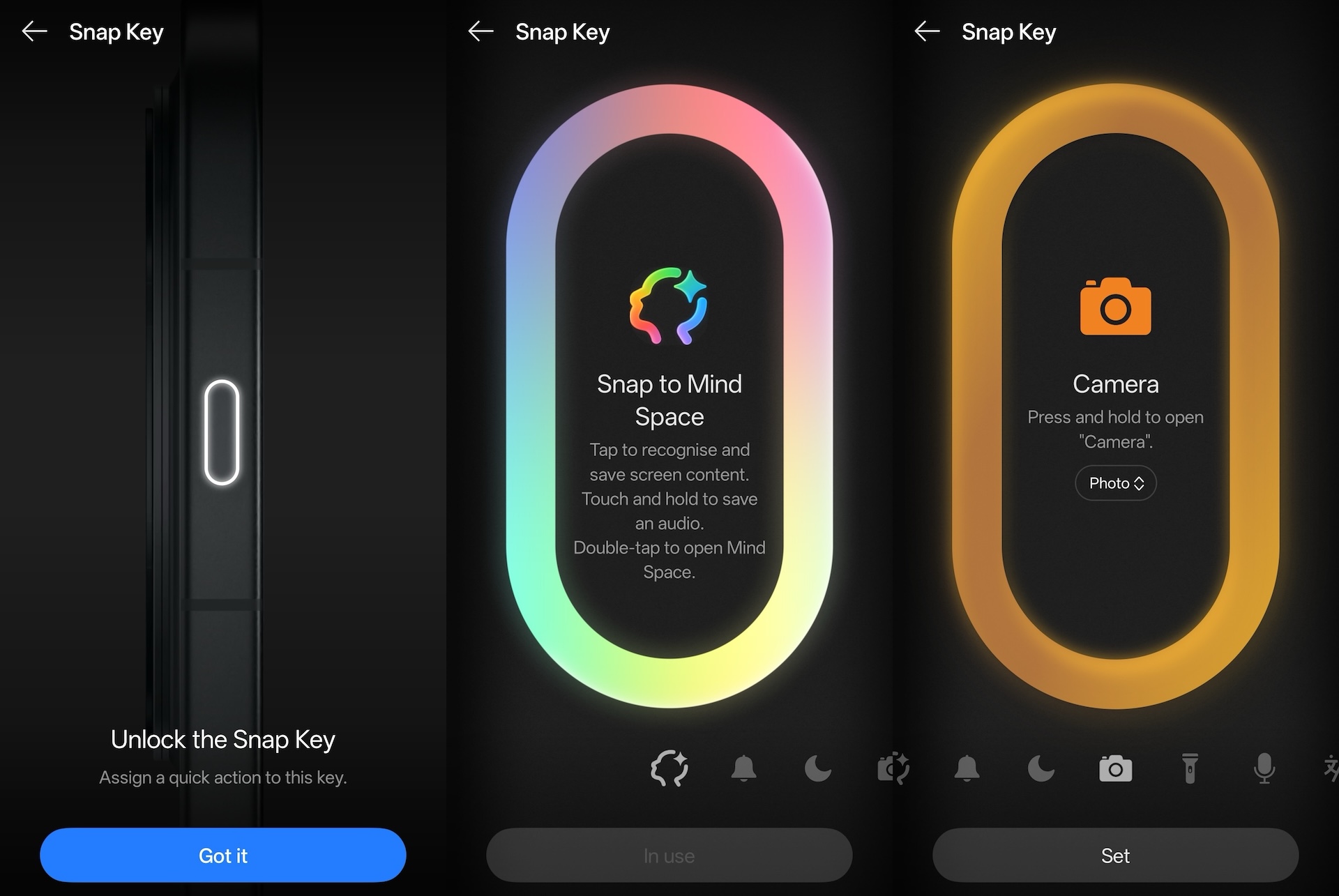 Även Pro har snabbknappen Snap Key på sidan som kan programmeras att aktivera tyst läge, starta kameran, ta en skärmbild och så vidare. Men den kan också starta AI-funktionen Mind Space. Där kan man spara text, inspelningar och skärmbilder som sedan organiseras och sorteras. Praktiskt för oss som tar skärmbilder för att komma ihåg saker men sedan inte kan hitta dem. Här kan man koppla Gemini till funktionen för att hitta, sammanfatta och få lite AI-hjälp att resonera med.