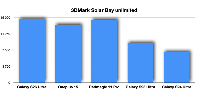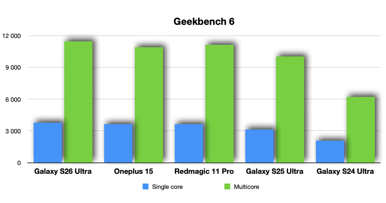 På insidan hittar vi Qualcomms Snapdragon 8 Elite gen 5 som är deras chip för 2026 års flaggskeppsmobiler. Den såg vi redan i november med Redmagic 11 Pro Subzero, som vi beskrev som en muskelmobil, så det är lätt att tro att de skulle vara lika snabba. Men Samsung har en deal med Qualcomm att deras kretsar är lite trimmade. Alltså slog den Redmagic i alla tester och slog prestandarekord på löpande band.