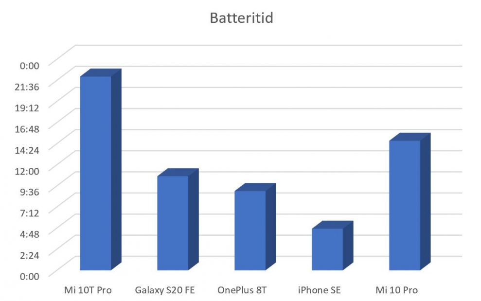 Eftersom Mi 10T Pro, liksom de flesta i klassen, använder samma Snapdragon 865-processor så är skillnaderna i våra prestandatester marginell. Den har dock aningen långsammare grafik än föregångaren. Tack vare ett större batteri och uppenbarligen strömsnålare skärm så uppmätte vi hela 22 timmars drifttid i PC Marks test, vilket är hela 50 procent bättre än föregångaren och den bästa batteritid vi någonsin uppmätt! Däremot har den långsammare uppladdning och stöder inte trådlös laddning alls.
