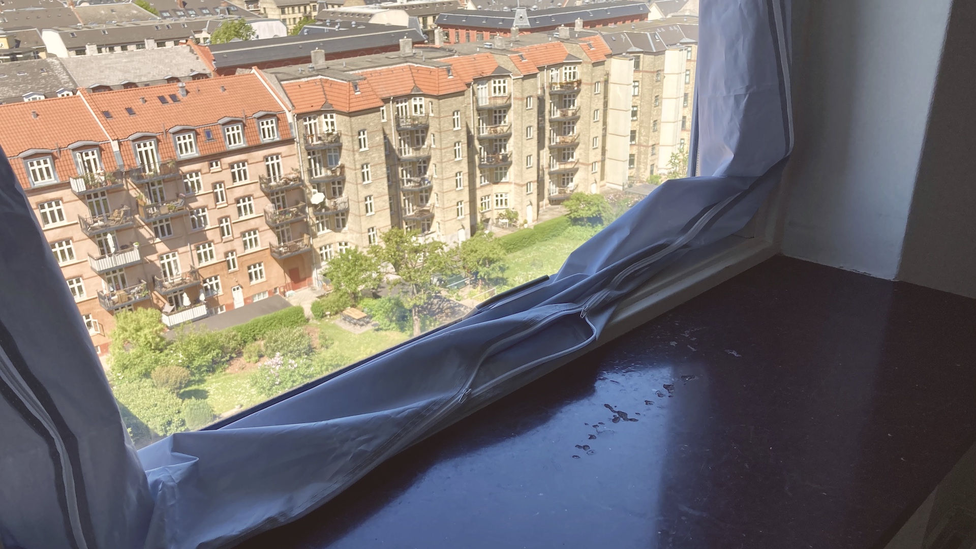 Slangens munstycke monterades i fästet och sattes i springan i det öppna fönstret. Tätningen stängdes sedan med dragkedja. (Foto: Natasja Broström)