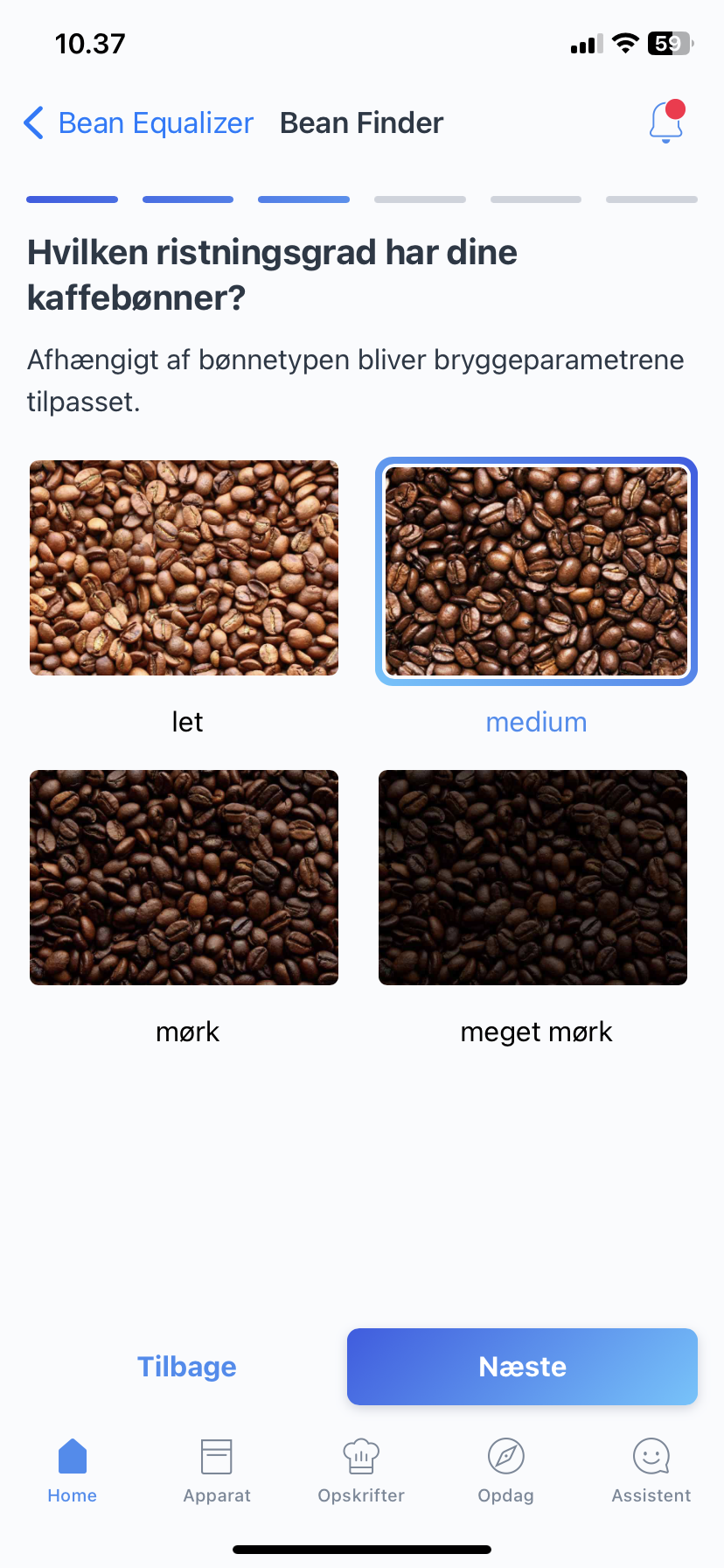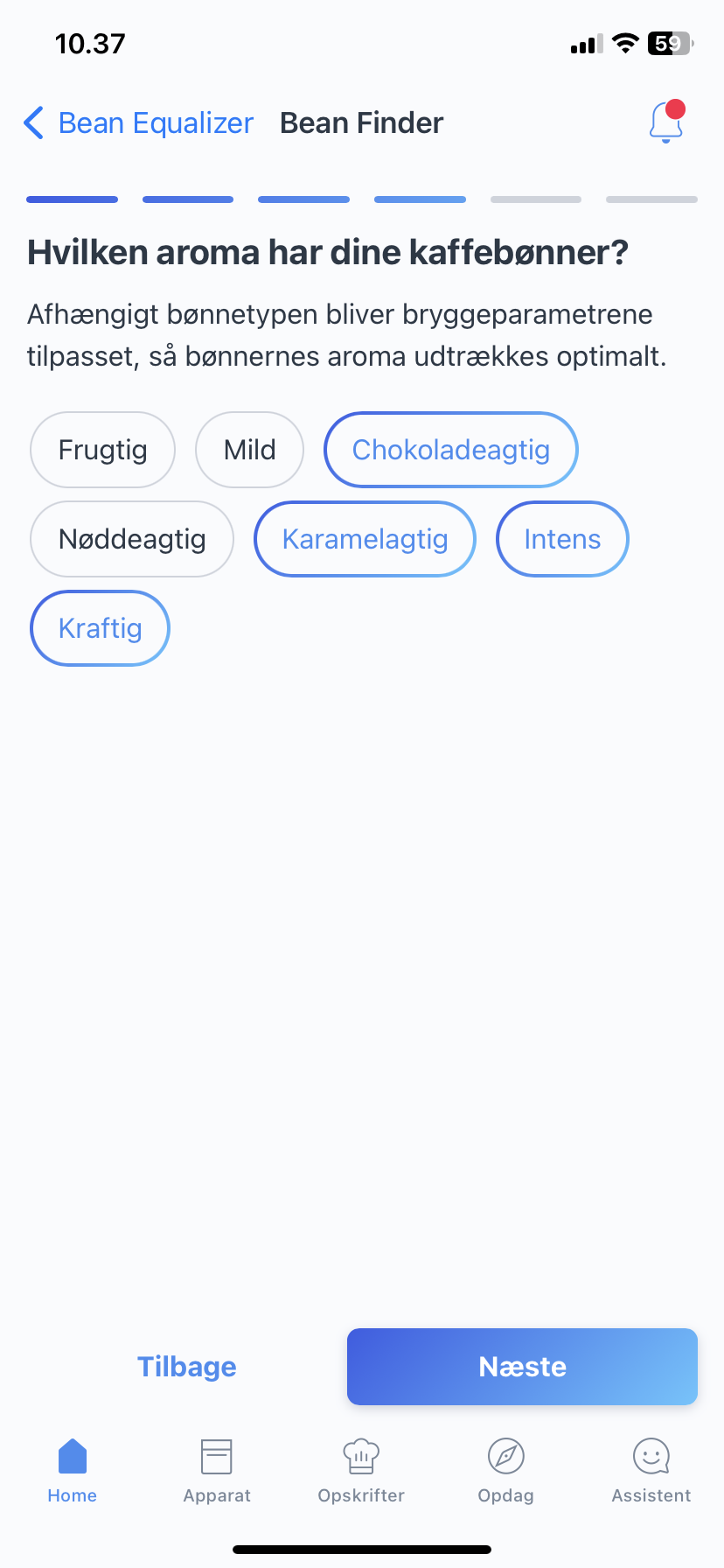 Maskinen har tre huvudmenyer för kafferecept: Profiler, Klassiker och coffeeWorld. Den första är till för dina personliga recept. Klassiker och coffeeWorld innehåller både olika kända och mindre kända kaffetyper. De är inte så logiskt uppdelade som man skulle kunna tro, så man får leta lite för att hitta sitt favoritkaffe. En enkel latte finns inte någonstans i menyerna. Om man vill ha en sådan måste man lägga till den i appen.