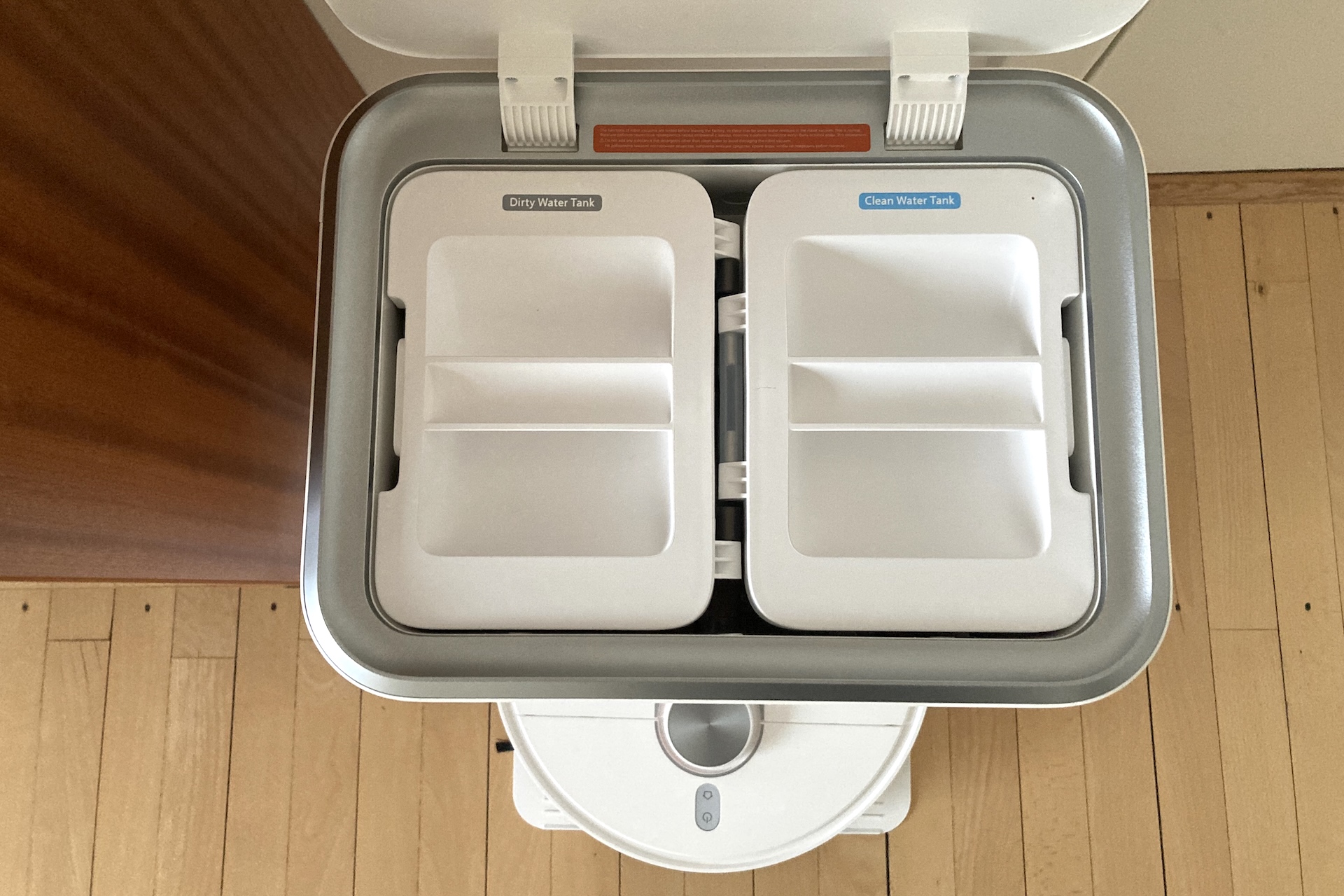 Tankarnas design följer den mall som konkurrenten Dreame nästan har gjort till standard. Xiaomis 3,8-liters mörka plasttank är för smutsvatten och den vita 4-liters plasttanken är för rent vatten. De passar in i varandra så att du inte kan sätta dem fel.